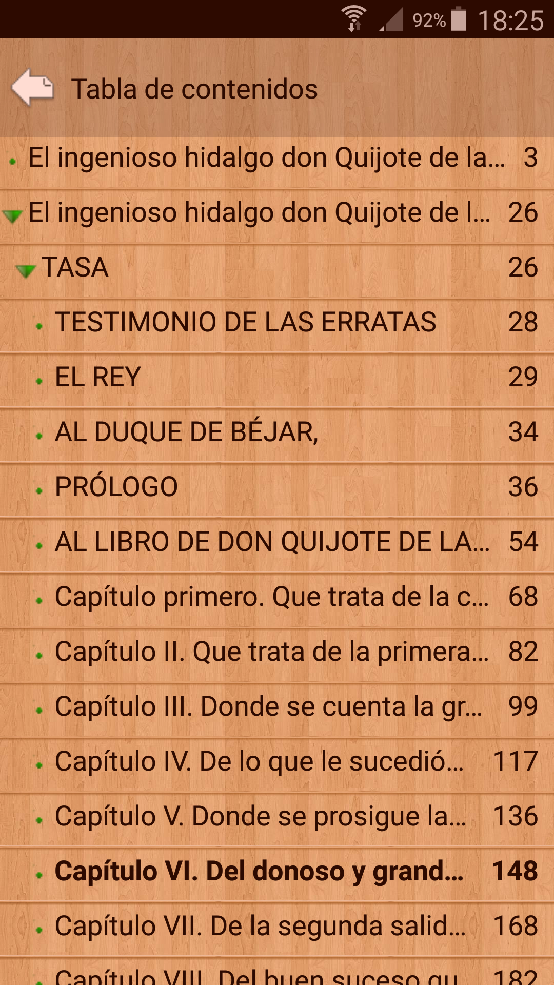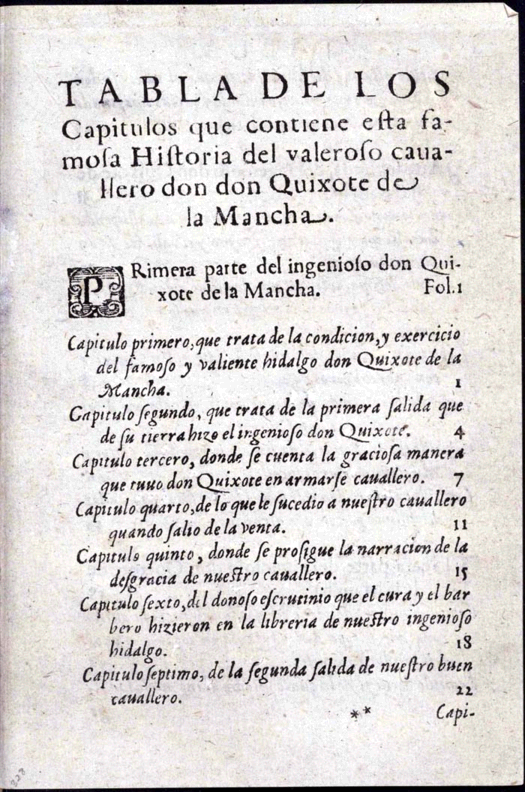 Antes de nada pulsemos suavemente en el centro de la pantalla, si fuera CoolReader, o mediante el procedimiento propio de la aplicación que usen, y abramos la tabla de contenidos del libro electrónico epub, el toc, llamado por estos pagos el índice, aunque en la primera edición del Quijote en 1605 existe con la denominación de Tabla de los capítulos, como se puede comprobar en esta imagen del facsímil de la Biblioteca Virtual Miguel de Cervantes.