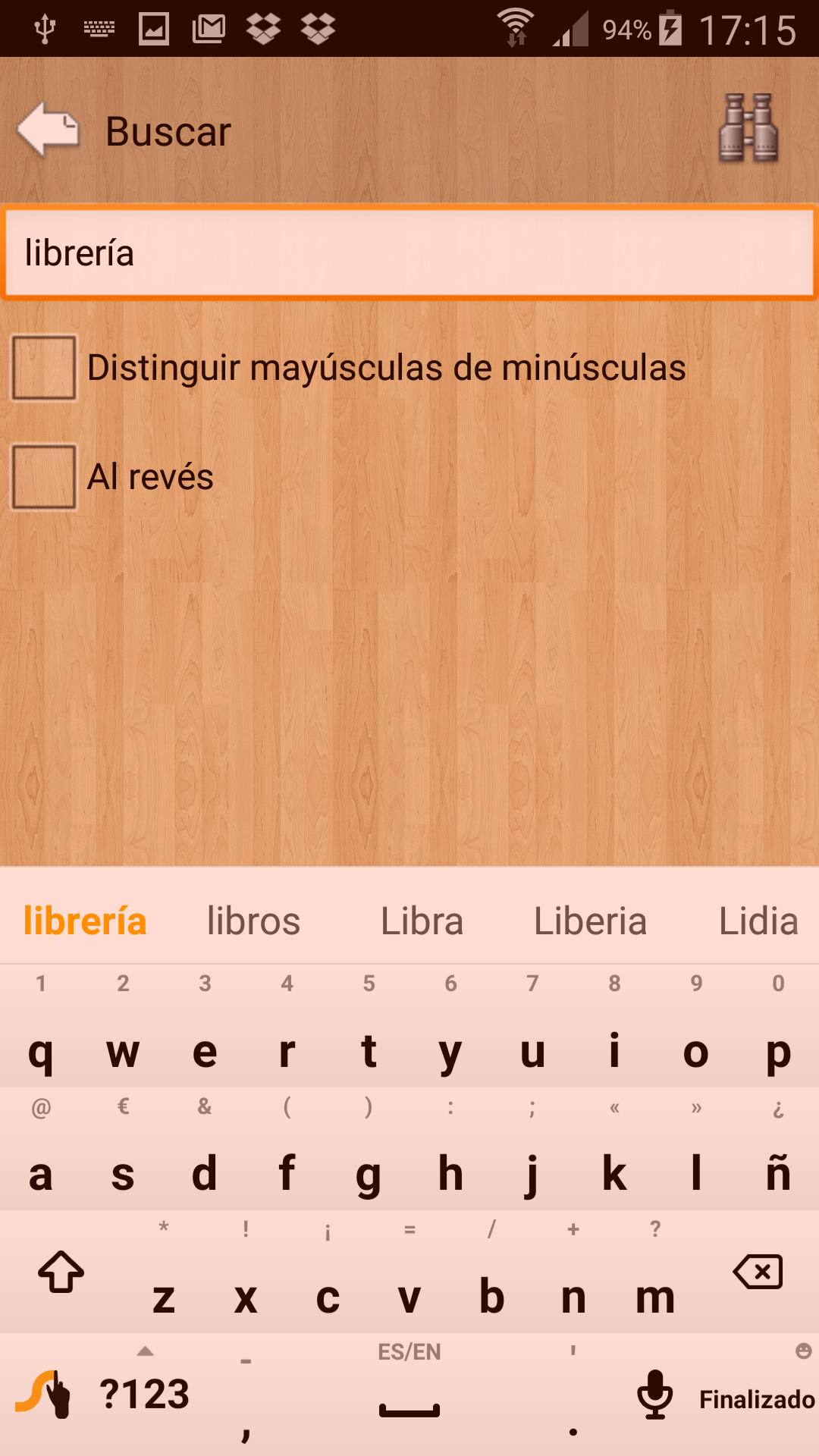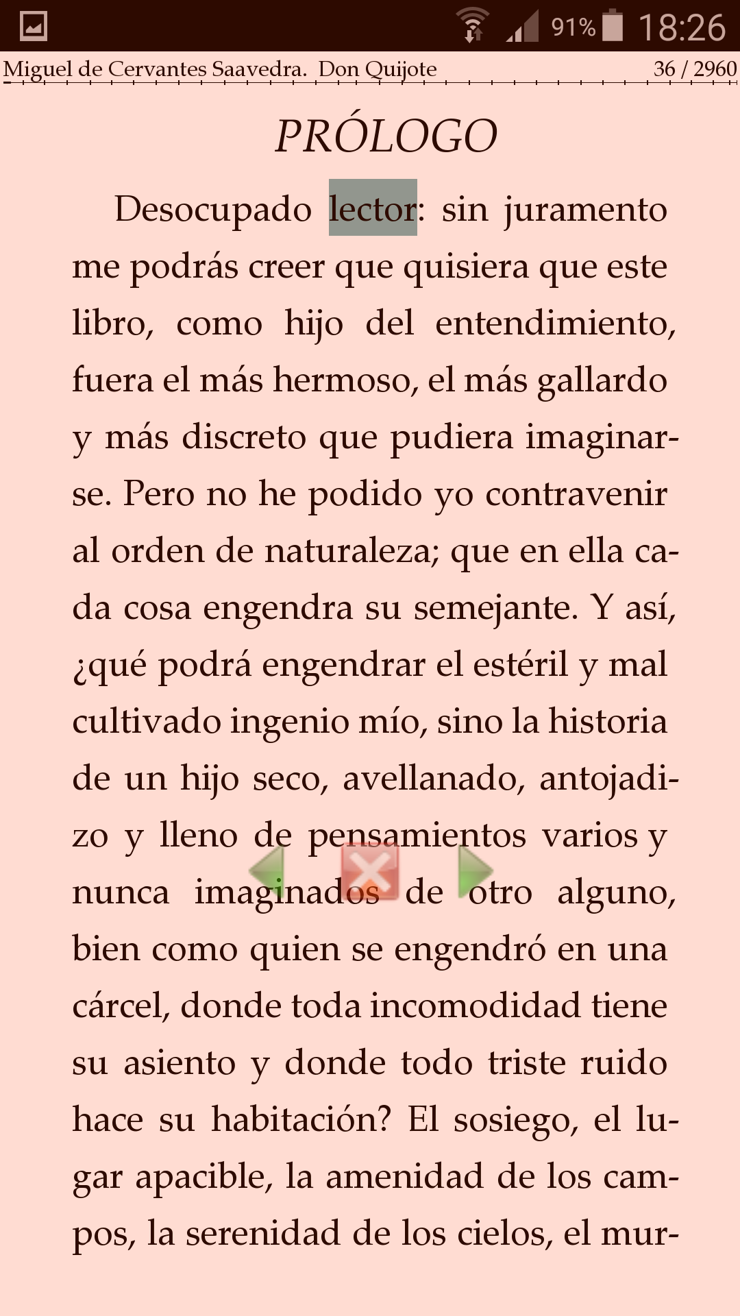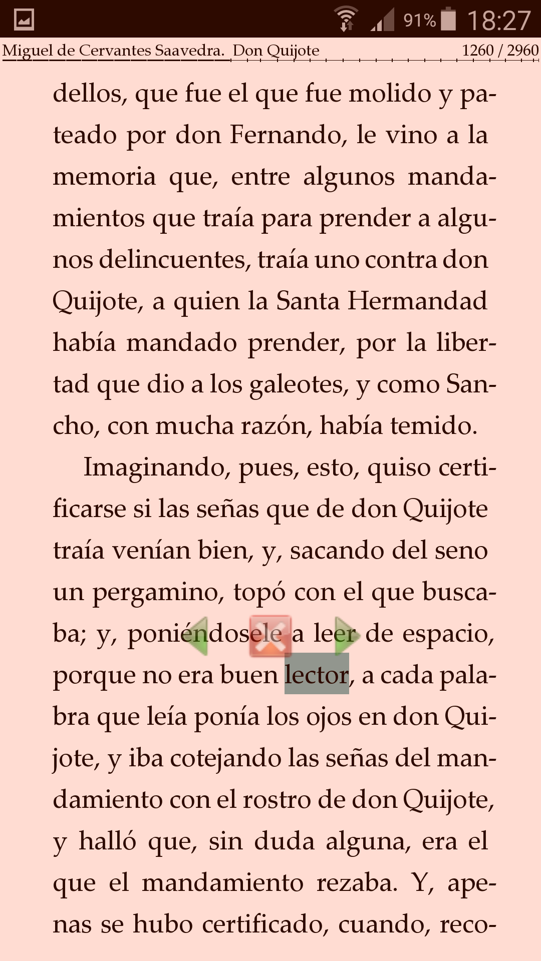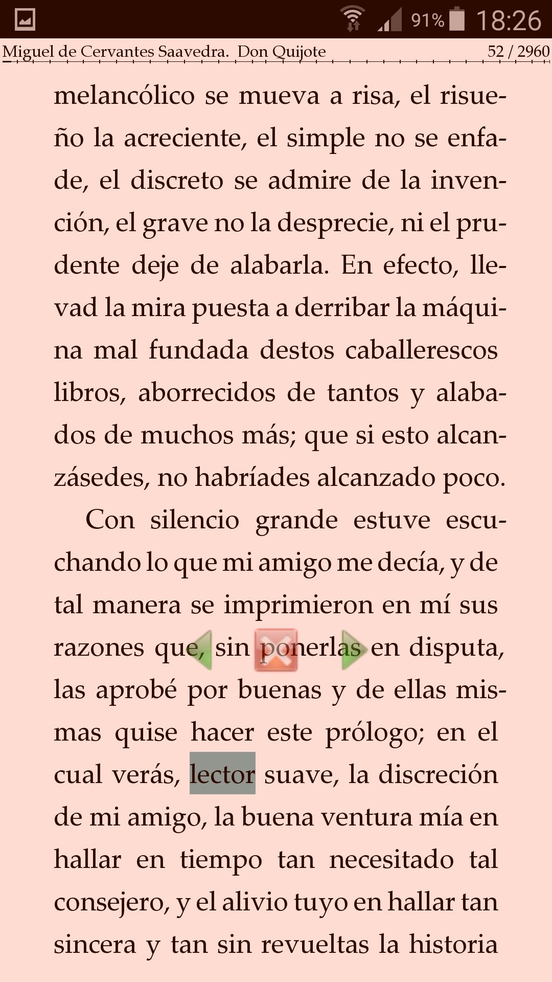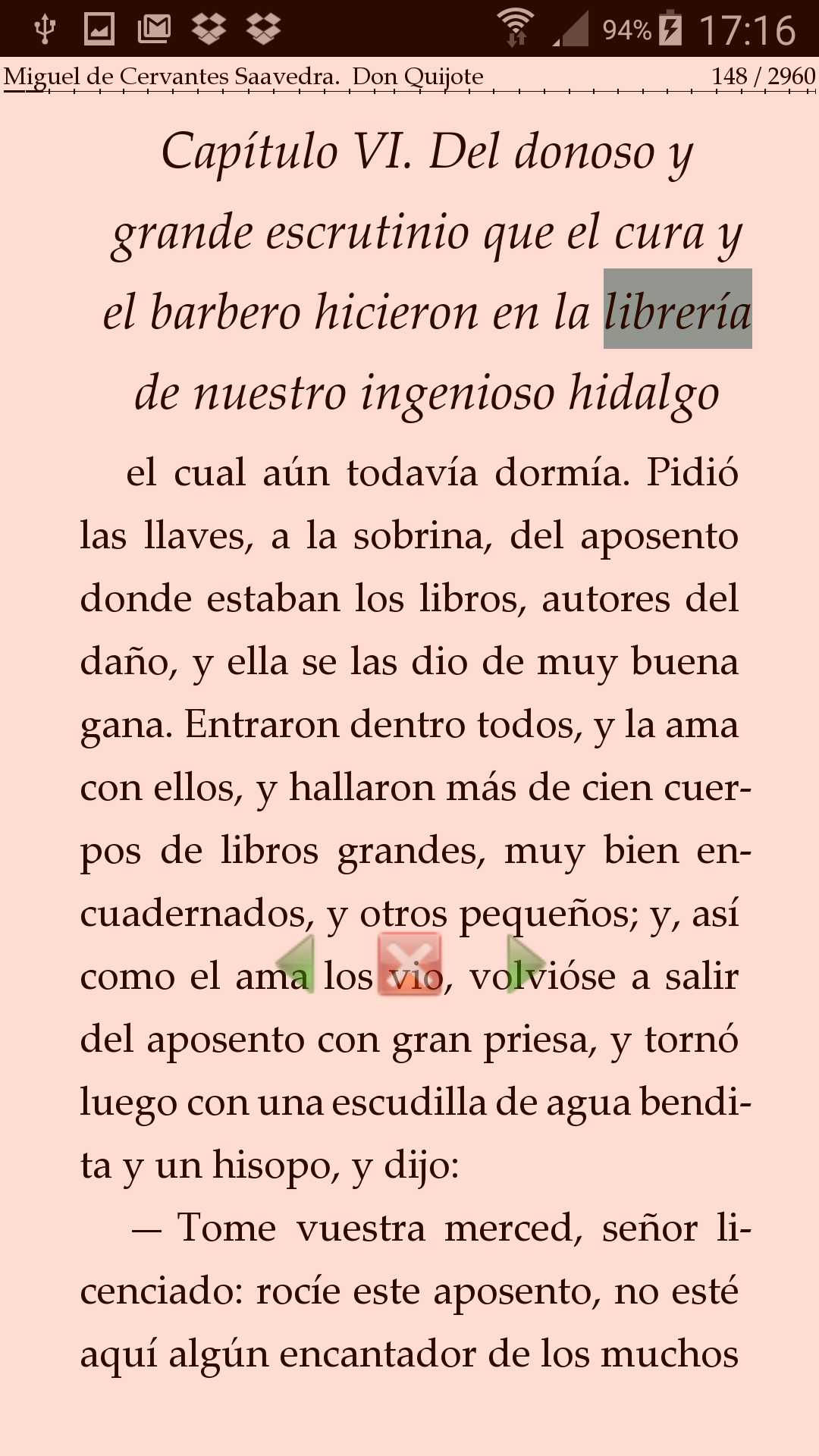 ¿Se acuerdan que queremos saber qué dice Cervantes de las bibliotecas y los lectores? Vamos a buscar la palabra biblioteca. O mejor, no la busquen, porque no la van a encontrar, Cervantes no la usa. En su lugar busquemos librería, que esa sí aparece. Pulsen en el icono de búsqueda que toda aplicación de lectura móvil tiene e introduzcan el texto que se quiere buscar; entonces, pulsen en buscar (en este caso, los binoculares).