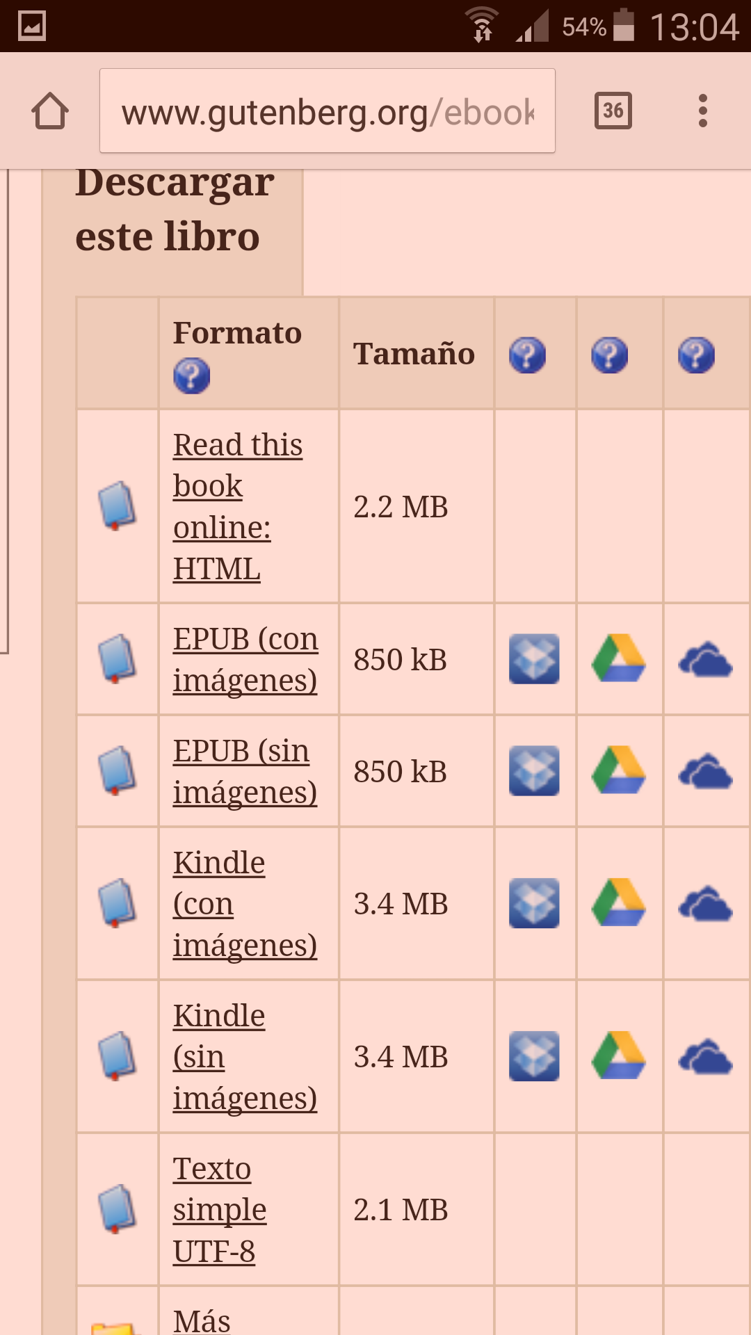 Luego, realicen esta búsqueda: «Proyecto Gutenberg don Quijote». Lo más fácil es dictarla, apretando en el icono del micrófono del buscador del móvil. Sí, sí, no sean pudorosos, háblenle al teléfono, que les hará bastante caso. Entonces les aparecerá un enlace a una página que ofrece varios formatos de descarga. Véanla: