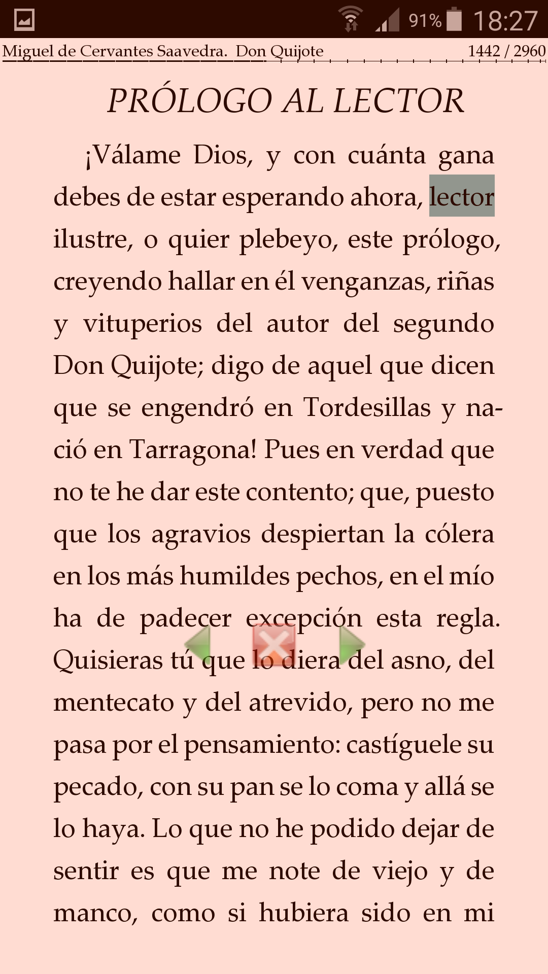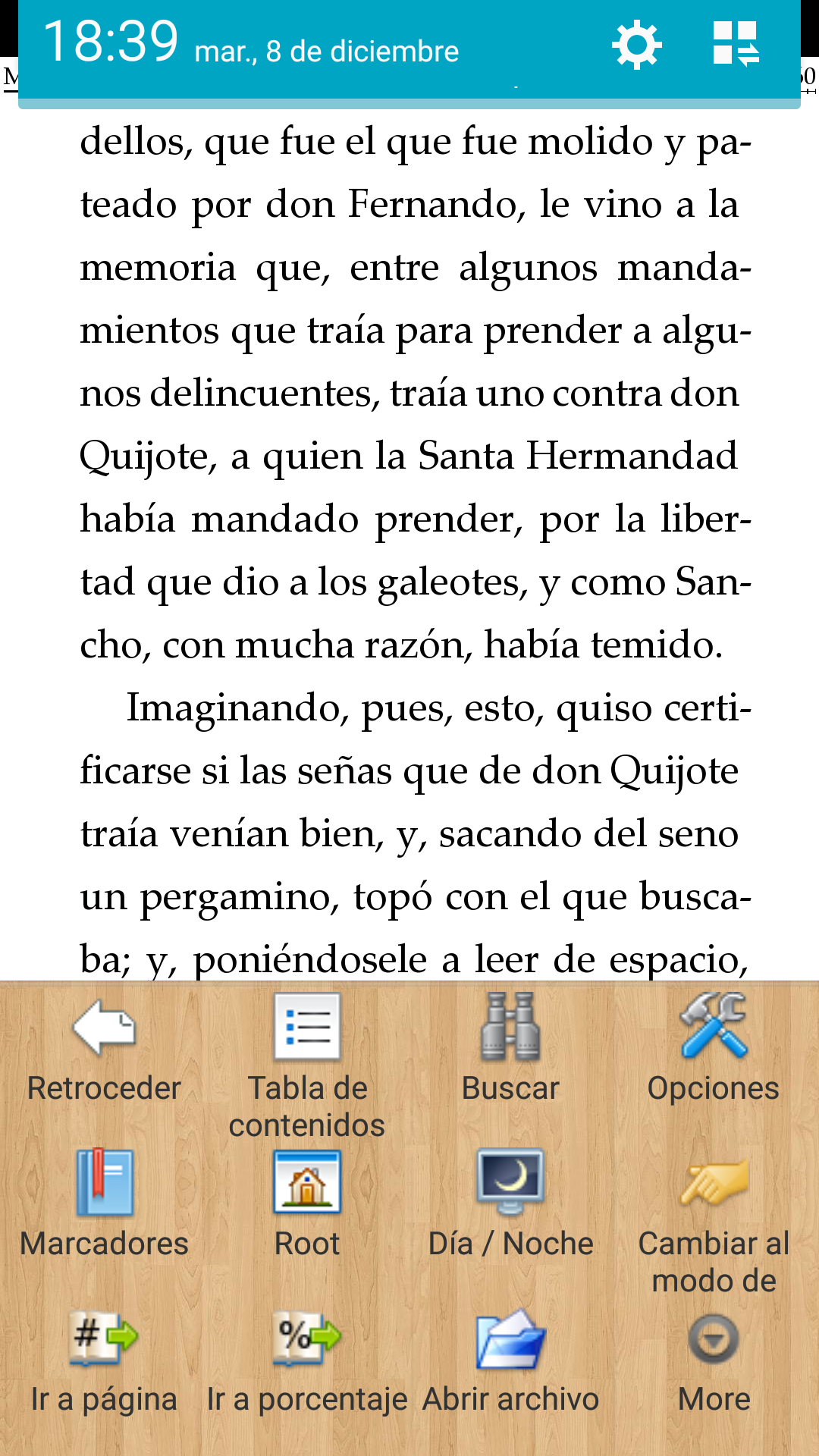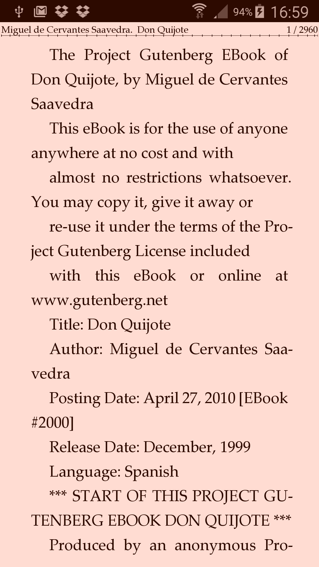 Yo voy a usar CoolReader, y al abrirlo esto es lo que veo: unos textos en inglés que presentan el Proyecto Gutenberg, la biblioteca digital más antigua del mundo, ya que se remonta a 1971. La idea original, que todavía hoy sobrevive, fue la de editar, mediante voluntarios que teclearan el texto, las grandes obras de dominio público y ponerlas a disposición de cualquiera con una conexión a la red, de forma gratuita y listas para su reutilización. Este Quijote se tecleó en 1999.