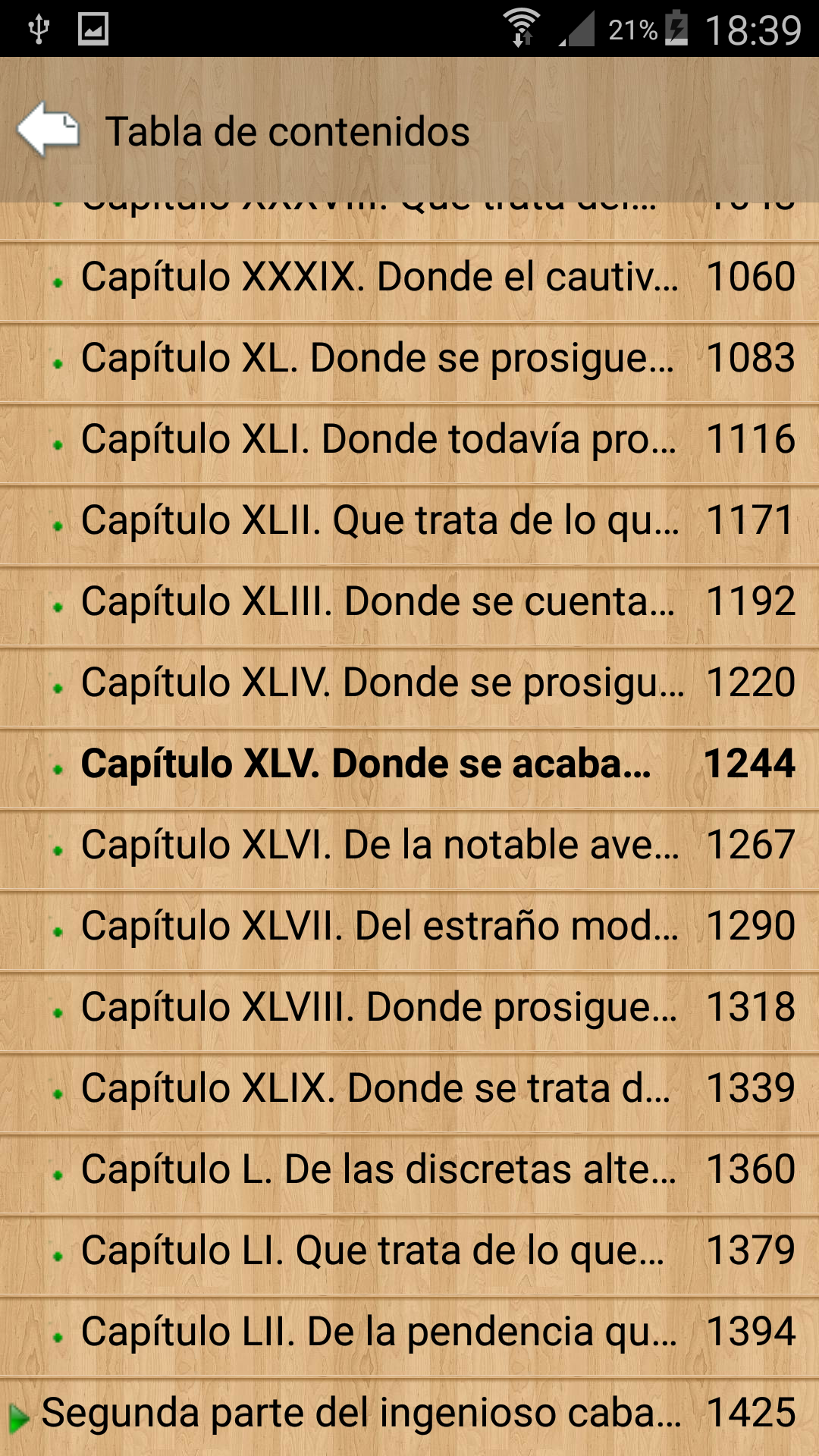 Es fácil, pulsa en el centro de la pantalla y escoge Tabla de contenido en la barra de tareas, la cual mostrará el capítulo en negrita: el LXV. Luego da para atrás, para volver al texto.