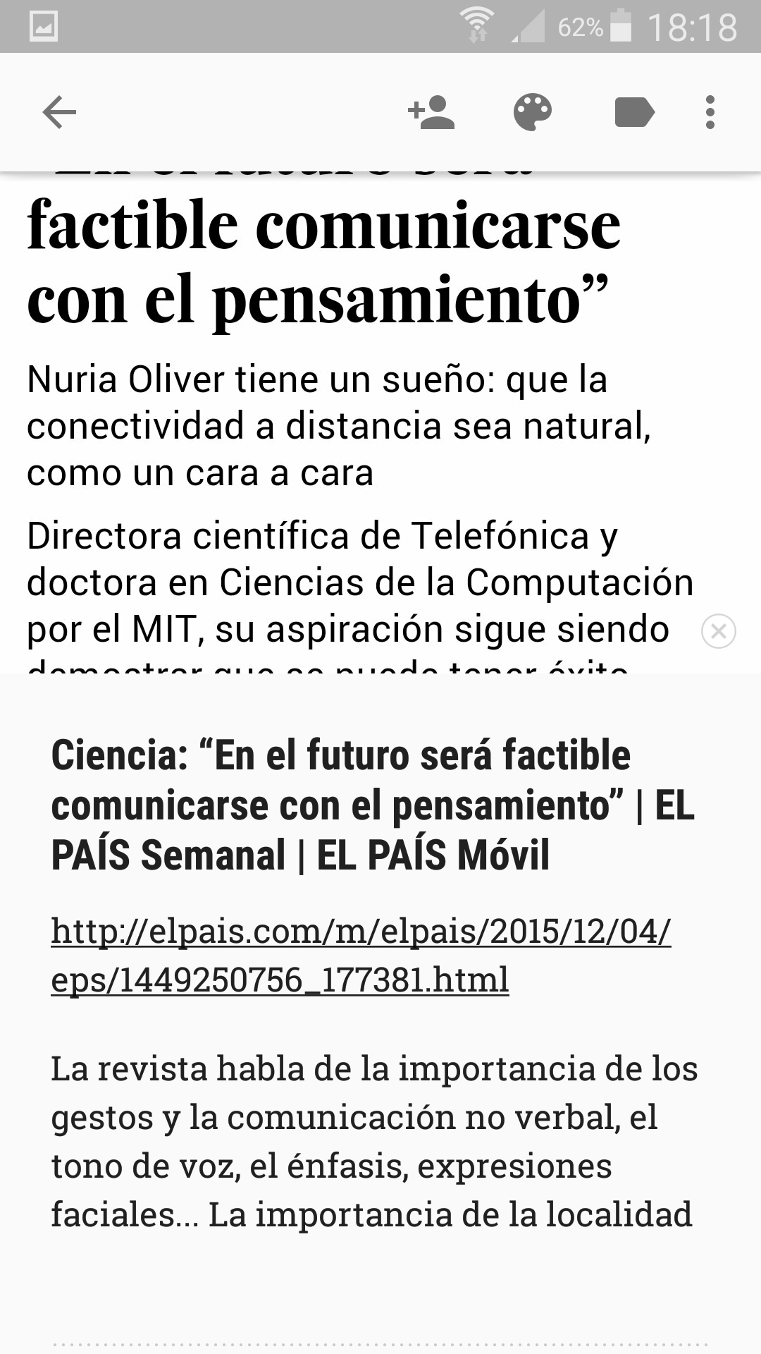 Una aplicación de móvil es lo mejor que se me ocurre: que conecte con el catálogo en línea de la biblioteca y necesite una cuenta de usuario, de profesor o alumno. De esa forma, si alguien encuentra algo de interés, como una noticia de prensa, podría catalogarla rápidamente. Voy a ponerles un ejemplo; no hace mucho se publicó un artículo de José María Izquierdo en el que entrevistaba a la doctora Nuria Oliver, una experta en tecnología móvil: mediante la pulsación en la opción de compartir se puede crear una nota en la aplicación Keep, como la que les voy a mostrar, o enviar un correo electrónico o un mensaje de chat. La propia opción de compartir recoge la URL de la noticia y el editor de la misma, en este caso la sección Tecnología de El País Semanal. En mi caso, he añadido unas anotaciones de mi cosecha sobre la importancia de la comunicación no verbal.