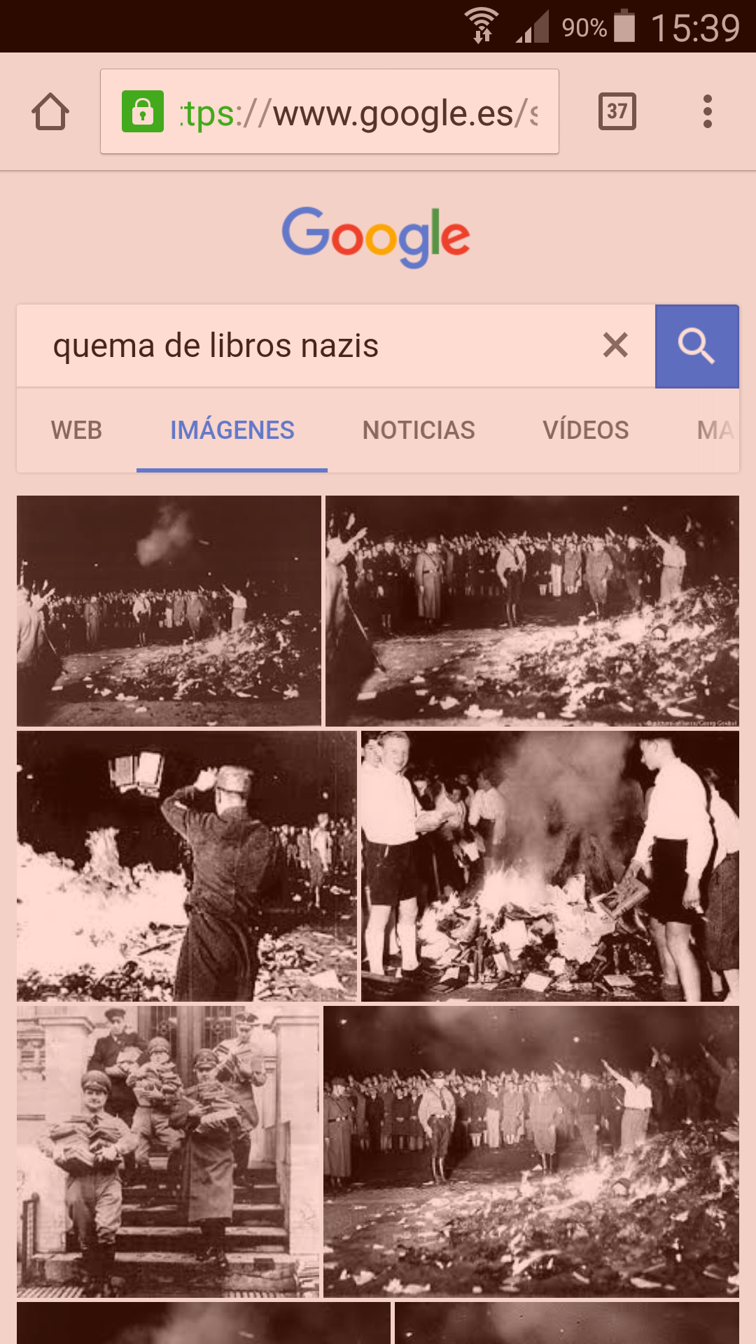 Las quemas nazis de libros ofrecen muchos resultados en la búsqueda de imágenes, es verdaderamente fácil dar con ellas, algunas especialmente repulsivas pues muestran la participación de muchachos jóvenes en la quema, como esos del pantalón corto, uniformados y sonrientes...
