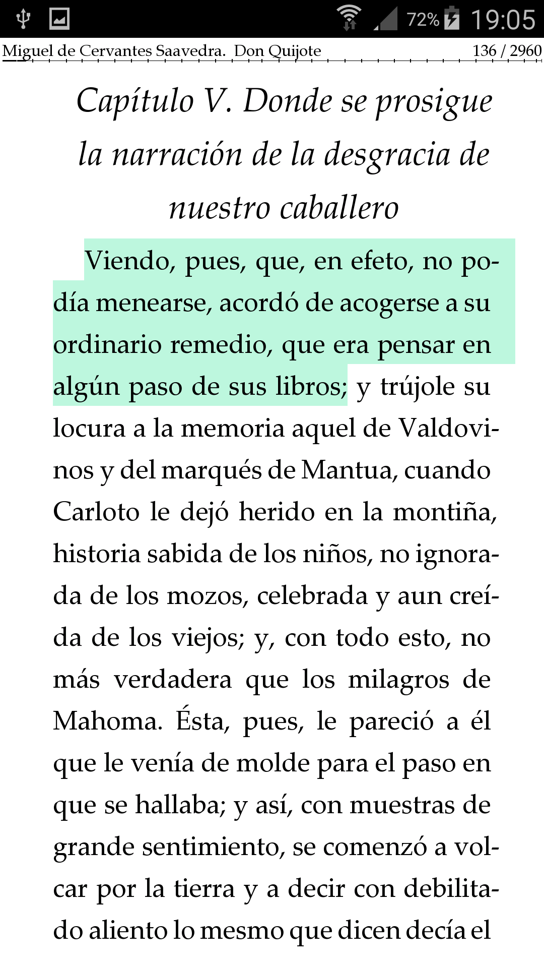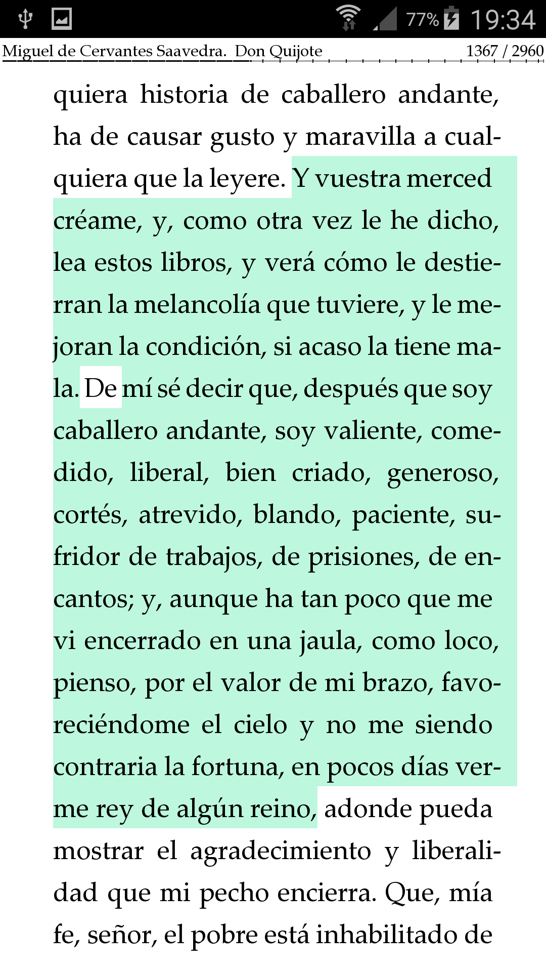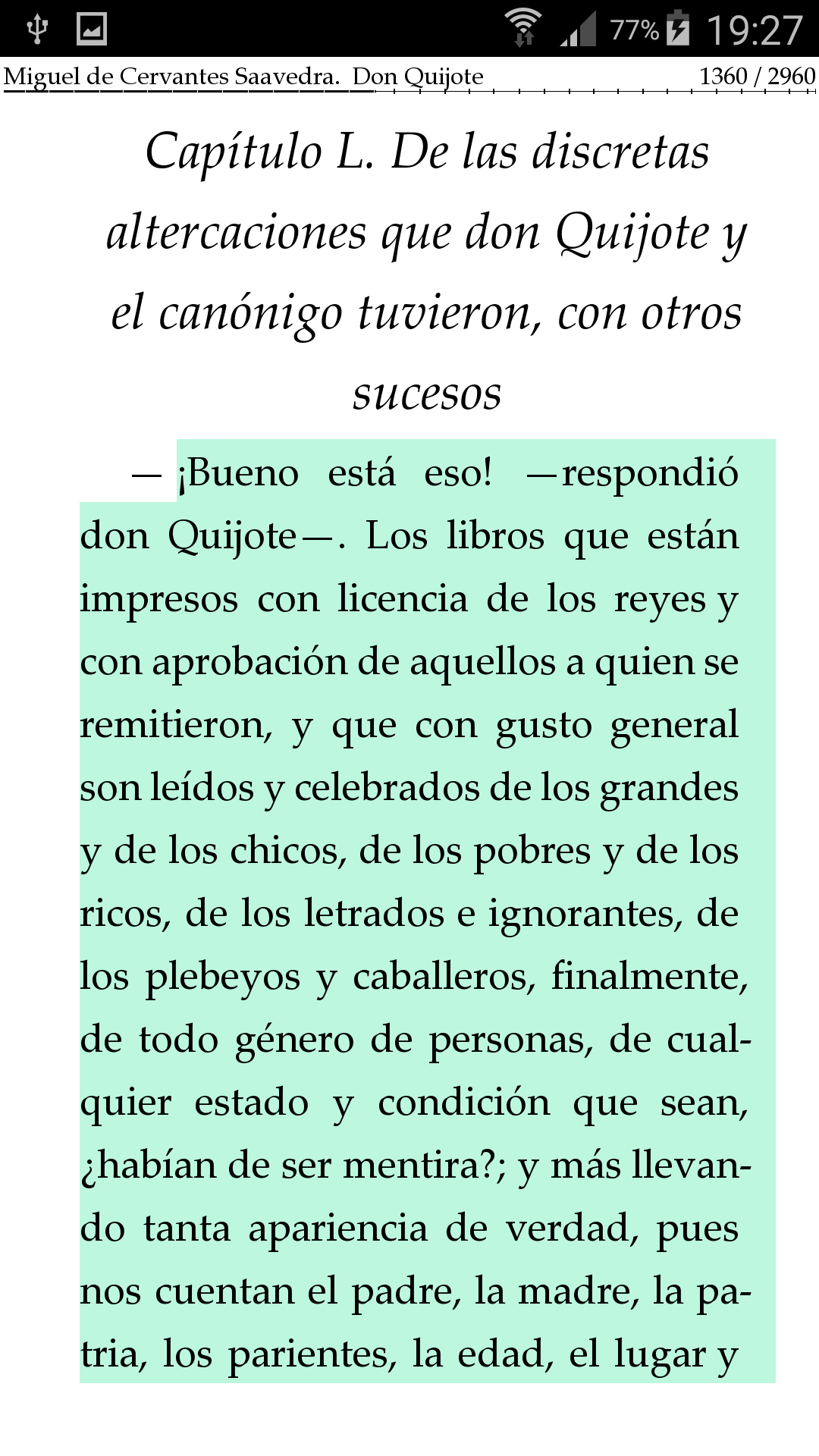 Hagámoslo así: es necesario que descarguen ustedes una versión del Quijote que se pueda abrir con alguna aplicación de lectura en el móvil, pongamos CoolReader o FBreader, aprovechando la wifi del instituto cuya clave del día de hoy les vamos a decir, suponiendo que no la sepan ya, es «Cervantes», por supuesto; por favor descarguen e instalen alguna de esas aplicaciones para Android u otra similar para otros sistemas operativos, si es su caso.