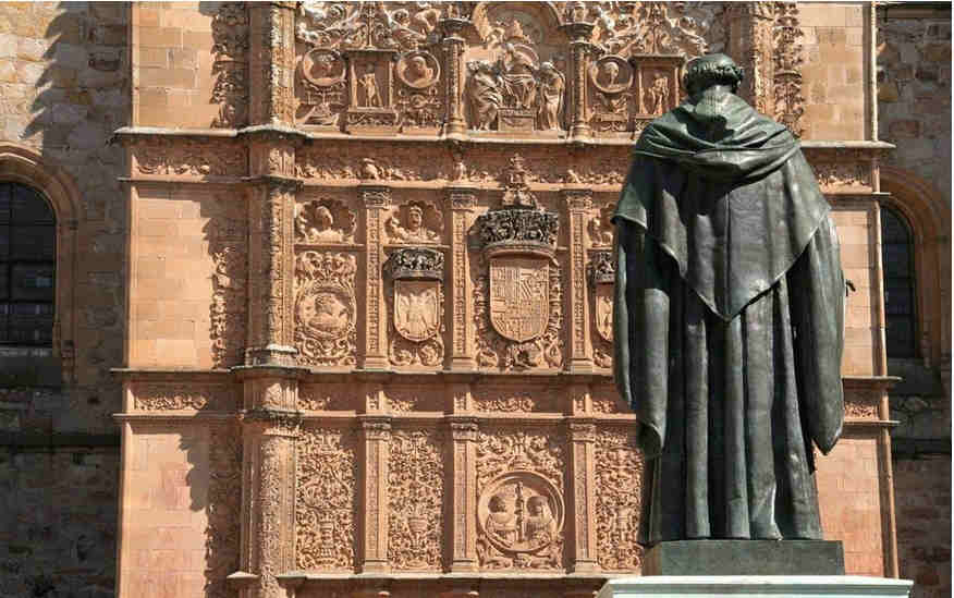 Estatua de Fray Luis de León (1868) colocada frente a la fachada plateresca de la Universidad de Salamanca. Fuente: Wikipedia.