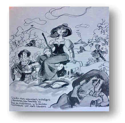 «Cuántos ricos mancebos, hidalgos y labradores han tomado el traje de Crisóstomo, y la andan requebrando por esos campos». (Ilustración de Antonio Mingote. Edición y notas de Martín de Riquer. Edit. Planeta, 2005).