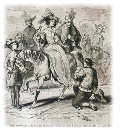 «Étant arrivé auprès de la belle chasseuse, il alla se jeter à genoux devantelle». (Dibujo de Tony Jobannot, de la edición francesa citada).