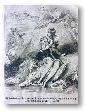 «Et, écartant ses cheveux, qu’elle avait sur le visage, regardait du côté qu’on avait entendu le bruit». (Dibujo de Tony Jobannot, de la edición francesa citada).
