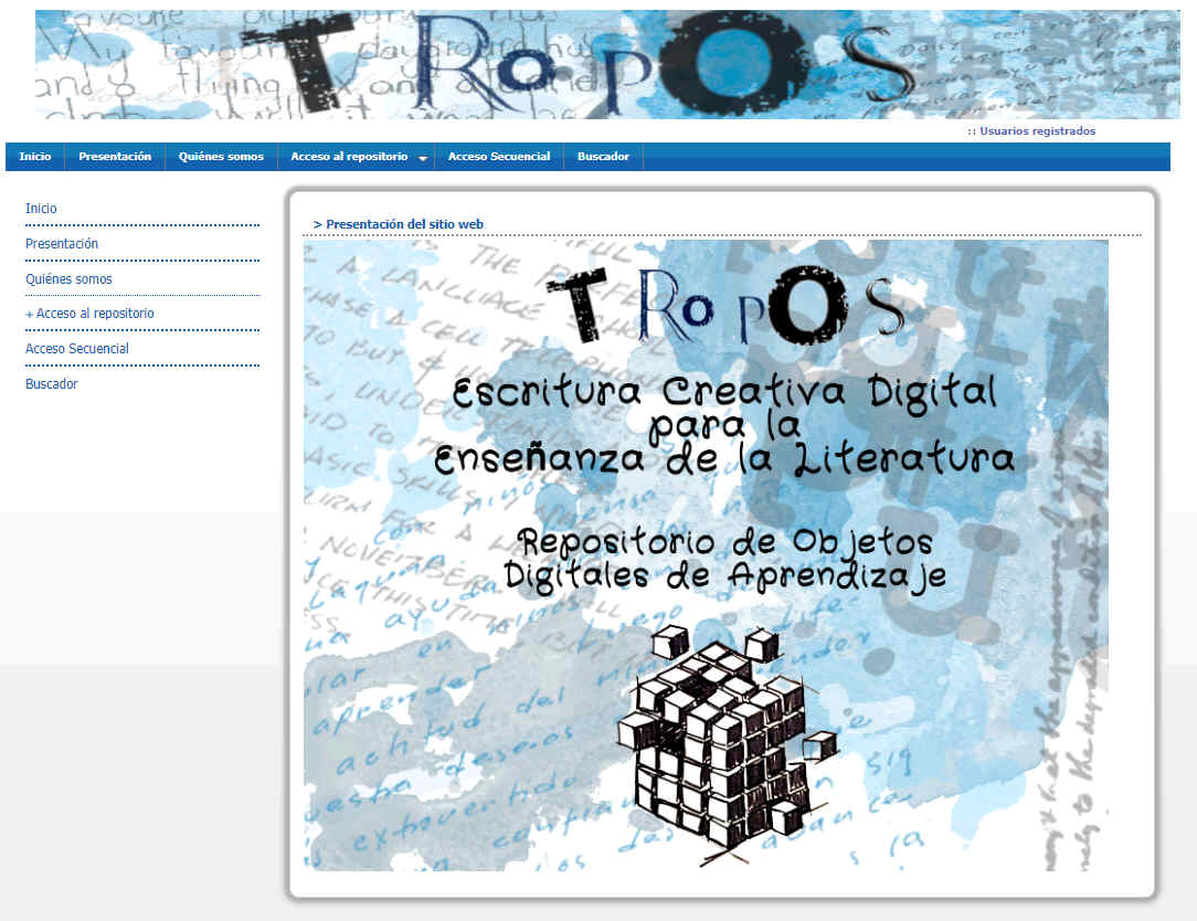 Es una Biblioteca de Escritura Creativa Digital que pretende sistematizar una metodología para el aprendizaje de la literatura a partir de la escritura en internet. Cada uno de los ejemplos de escritura de Tropos viene acompañado de una ficha didáctica en la que se apuntan todas sus posibilidades como objeto didáctico y se ofrecen unas pautas para facilitar su reusabilidad, de manera que resulten útiles para cualquier profesor de Primaria, Secundaria o Universidad que encontrará aquí ideas y propuestas para enriquecer su práctica docente.