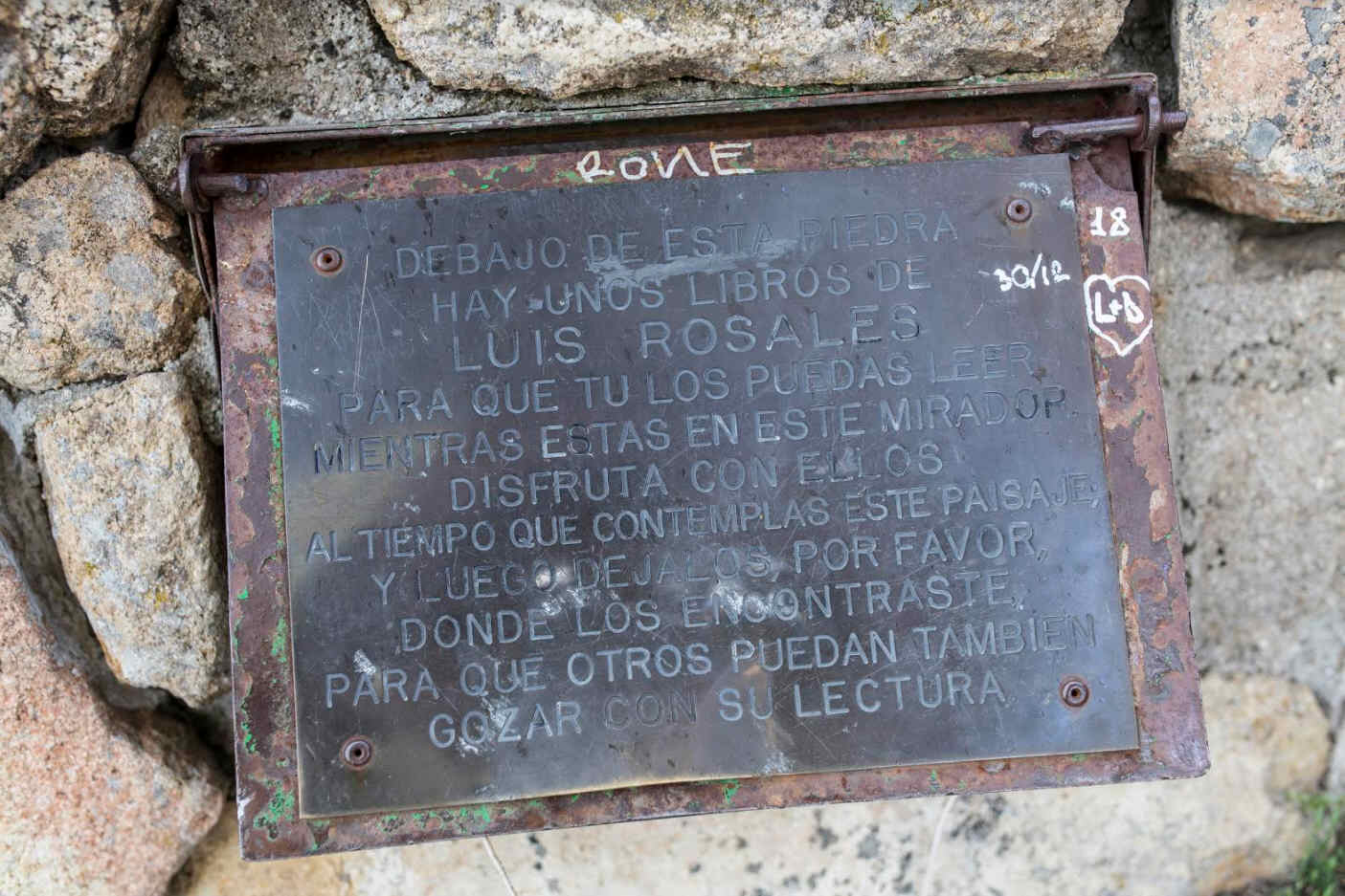 Debajo de esta piedra hay unos libros de Luis Rosales para que tú los puedas leer mientras estás en este mirador, disfruta con ellos al tiempo que contemplas este paisaje y luego déjalos, por favor, donde los encontraste, para que otros puedan también gozar de su lectura.