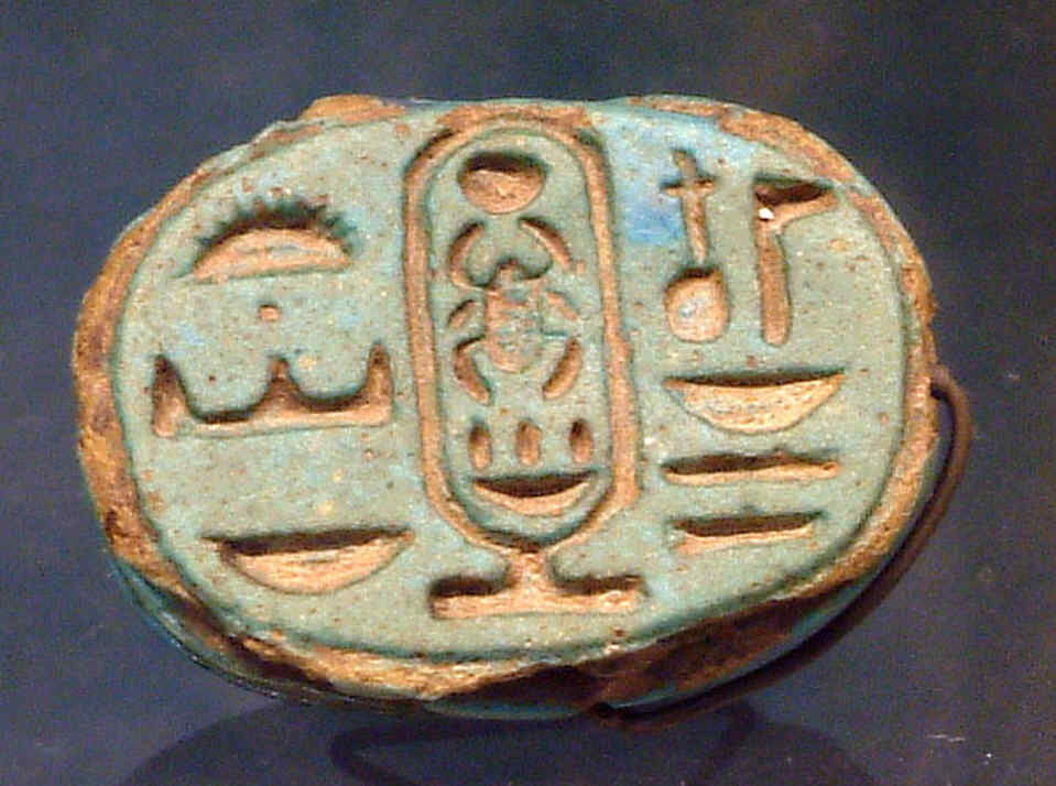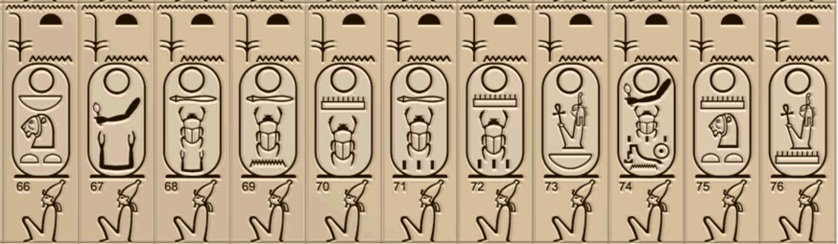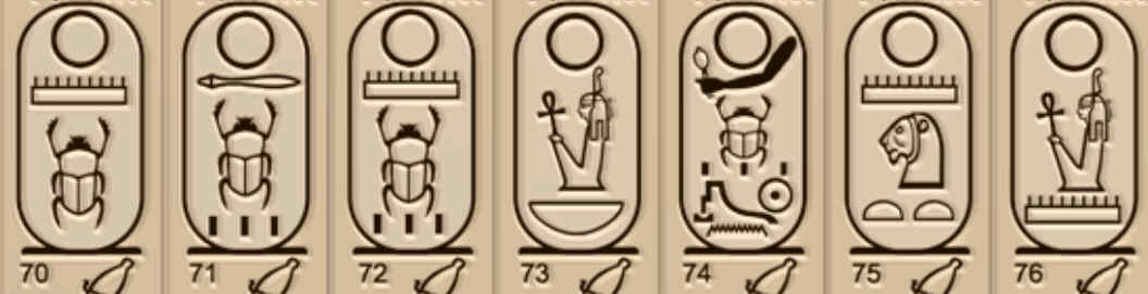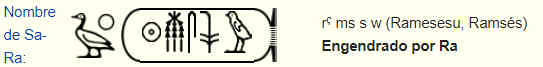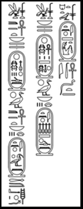 ──El nombre que has escrito corresponde al título que recibía el faraón como «Hijo de Ra», que era uno de los cinco tratamientos que se adjudicaban a los faraones al acceder al trono. A la izquierda aparece el jeroglífico del epíteto hijo de Ra (el ideograma del sol junto con el determinate de hijo) y a la derecha, encerrado en un cartucho, algo exclusivo de los reyes coronados, el jeroglífico con su nombre de nacimiento. ¿Alguien más ha escogido nombres de faraones? Ya veo, poder disponer de una corona tira mucho. Habréis descubierto que todos ellos son nombres parlantes, es decir que en sí mismos significan algo. Mi nombre, Sinuhé, por ejemplo, significa «Hijo del sicomoro». ¿Y los vuestros?