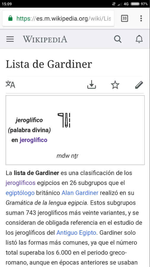 Vuestro profesor de Historia y yo habíamos pensado inicialmente no daros ninguna indicación, para que buscarais en Internete ─¿os gusta el neologismo? Se lo he oído a mi compañero Luis y lo he adoptado como mascota─, como mejor os pareciera, a ver qué peces podíais pescar, pero luego lo meditamos mejor y, dada la abundancia de materiales de todo tipo de pelaje que hay sobre el Antiguo Egipto y lo fácil que es perderse entre tanta paja, os vamos a dar algunas pistas fiables para empezar, concretamente un recurso digital magnífico que se encuentra dentro de la Wikipedia, y que se llama la Lista de Gardiner, en honor del egiptólogo británico. Esa lista es una clasificación de los jeroglíficos egipcios en 26 grupos, que forma parte de una gramática que escribió a principios del siglo pasado. ¿Habéis llegado ya?