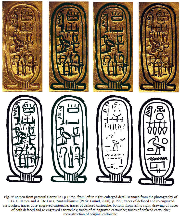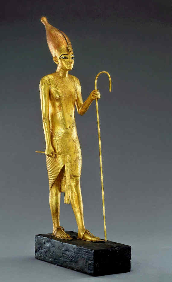 ¿Y si la máscara de oro de Tutanjamón en realidad fue hecha originalmente para una reina faraón que llevaba un orificio en las orejas, cosa que los adultos varones no utilizaban? ¿Y si la máscara y buena parte del ajuar funerario de Tutanjamón fuera usurpado y más tarde adaptado para él, cambiados los jeroglíficos para que apareciera el Neb-Jeperu-Ra? ¿Y si esa reina faraón Neferneferuatón gobernó pero su rastro ha desparecido casi por completo y sólo quedan pequeños detalles, escasas evidencias, pero suficientes para armar un argumento y montar una interpretación distinta de la oficial? Mirad esta escultura del faraón andante que apareció en la tumba de Tut y que tiene formas de mujer, pechos bien marcados; se creyó que era él, pero seguramente es ella.