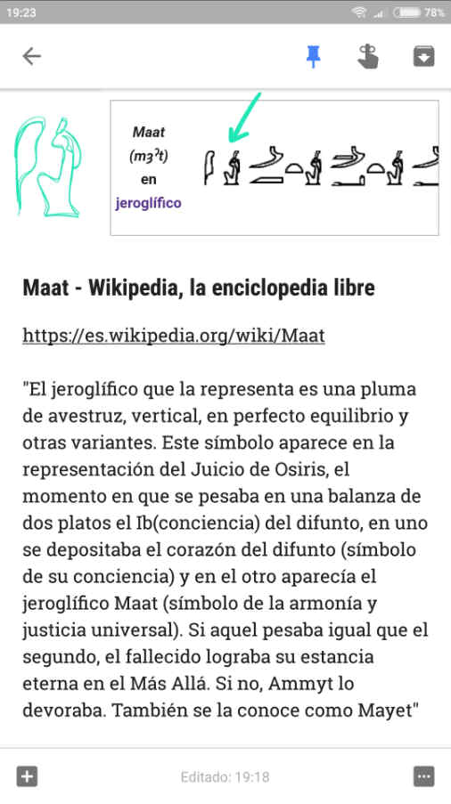 En fin, vamos a programar una práctica cuyos resultados trataremos el próximo día. Consiste en crear una nota digital titulada con el nombre propio egipcio antiguo que hayamos elegido, que incluya tanto su transcripción al castellano como la pronunciación y la anotación de los jeroglíficos implicados. Hay que añadir también el dibujo a mano correspondiente (Lectodigitantes, 2014), utilizando la técnica de escritura a mano digital para dibujar los signos propios de la escritura jeroglífica, los jeroglíficos. No importa que os salga un churro al principio. Por último hay que asegurarse que la nota incluye la dirección URL del sitio web que nos ha servido de fuente, y de donde hemos tomado la información. Esta es mi nota sobre Maat: