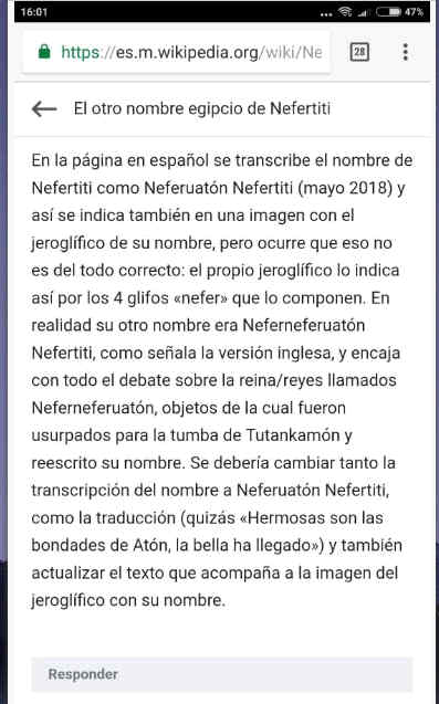Essai dramatisé, sous la forme d'un colloque dans la classe du lycée, sur les compétences numériques liées à la recherche d'informations, l'utilisation des sources primaires et secondaires, l'analyse et l'interprétation des preuves, et référence bibliographique, en particulier Wikipedia, dont une analyse critique est fait. De nombreuses recherches sont effectuées à l'aide de telephones portables, mettant en évidence leurs possibilités didactiques, en particulier l'utilisation d'images et de la prise de notes numériques et autres techniques propres de l'apprentisage mobile. Une recherche interdisciplinaire sur les sujets de Langue Castillane et d'Histoire, sur l'écriture hiéroglyphique et la périod de Amarna de l'Egypte ancien, le monde des références de Don Quichotte et l'époque actuelle, où l’utilisation des émoticônes et emoji en écriture numérique est de plus en plus fréquente.