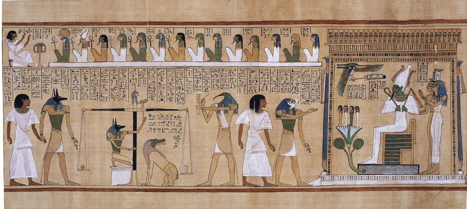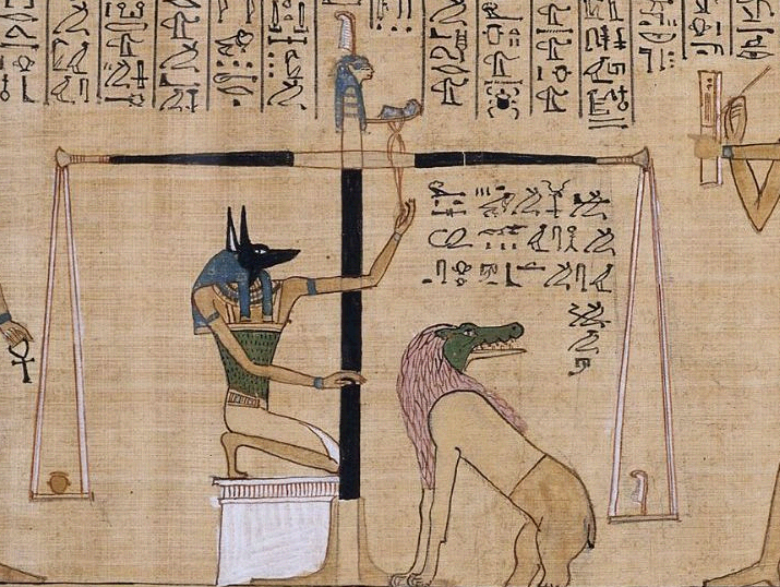 ──¿Recordáis El Juicio de Osiris? Es la representación egipcia del tránsito al más allá, en el que el corazón del difunto, el ib, que recoge el comportamiento de la persona en vida, se pesa en una balanza contra la pluma de Maat, que representa la Verdad y el comportamiento correcto. Cuarenta y dos dioses hacen preguntas, cuyas respuestas aumentan o disminuyen el peso del corazón del difunto.