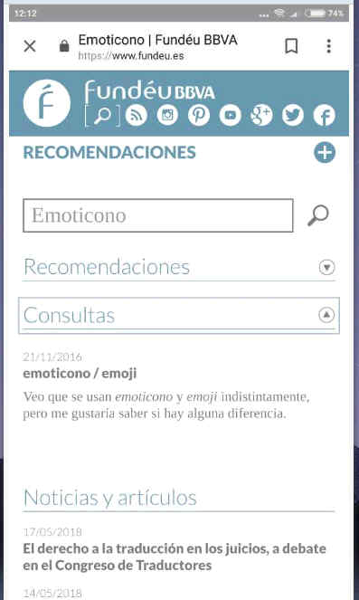 ──A ver qué os parecen este resultados sobre el término «emoticno», con la errata de la falta de la o, en el buscador urgente de dudas de la página de Fundéu, que es «asesorada por la Real Academia Española», está siempre en línea y es utilísima para expresarse con corrección.