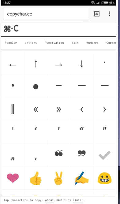 ─Yo conozco, maestra, una web para incluir todo tipo de símbolos de escritura, copychar.cc. Al acceder a ella mediante el navegador y pulsar en uno, se copia en el portapapeles el símbolo escogido y luego se puede pegar donde estemos escribiendo. Lo tiene todo, todo: letras, puntuación, signos, números, símbolos, flechas, emojis...