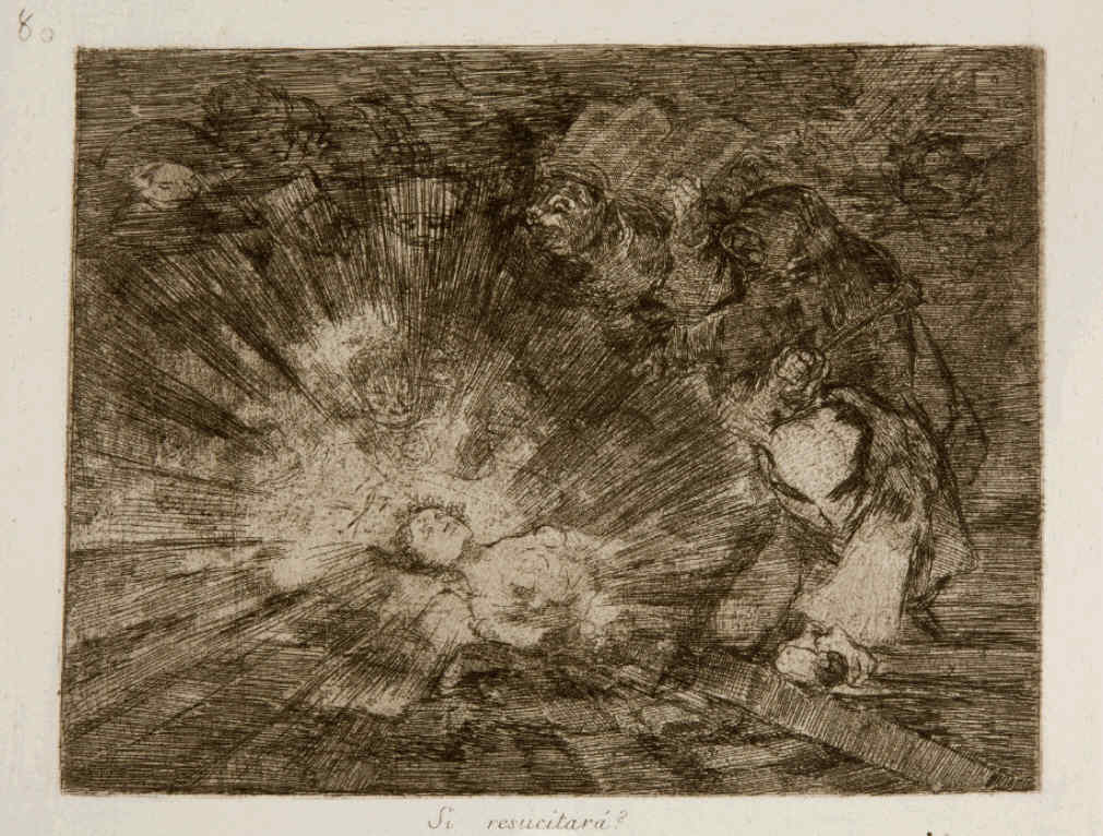 ──Al hilo de esto, quiero mencionar un caso precioso sobre la ambigüedad, que he estado tratando con el maestro Sinuhé: es esta frase que usa Goya en una de las últimas estampas de los Desastres de la guerra, que contiene un texto escrito, Si resucitará, con tilde. Aquí se muestra cómo representa Goya el entierro de la Verdad en la guerra cruel. ¿Qué creéis que significa?