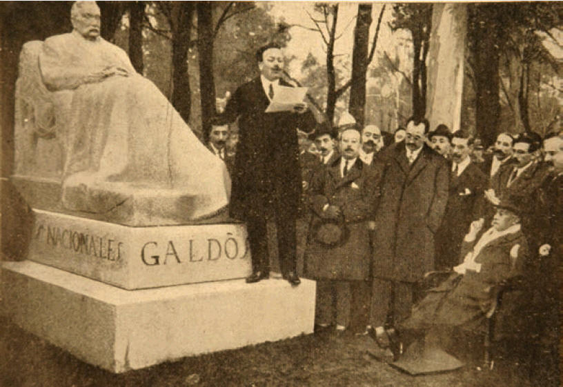 El 20 de enero de 1919, casi un año antes de su muerte, se inauguró en el parque del Retiro de Madrid, en el paseo de Fernán Núñez, un monumento en su honor erigido por suscripción pública. Galdós, prácticamente ciego, pidió ser elevado para palpar la obra creada por Victorio Macho, un escultor joven que no había cobrado por su trabajo. La escultura sigue en su situación original y ha sido el lugar elegido para el primer acto de su centenario, celebrado el día que se cumplía un siglo desde su fallecimiento. El Ayuntamiento de la capital se adelantó, a finales de 2019, al recordar la relación de Galdós con Madrid otorgándole el título de Hijo Adoptivo.