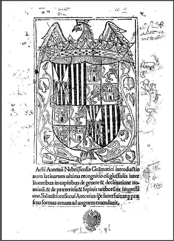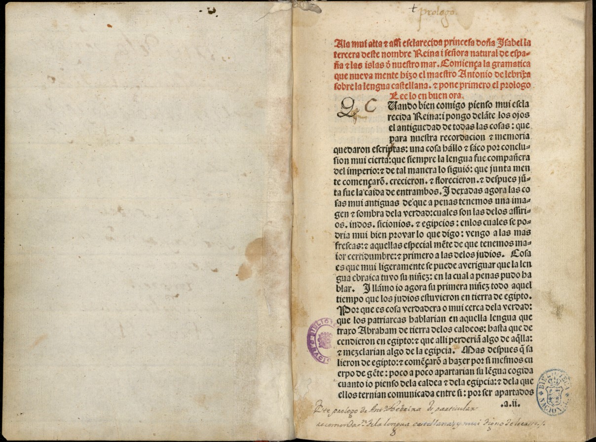 Prólogo de la célebre Gramática de Nebrija (1492) con dedicatoria a la reina Isabel la Católica (quien, en un principio, no mostró interés por la obra) e inclusión de su celebérrima cita: «siempre la lengua fue compañera del Imperio», en su contexto. Como curiosidad, hay que decir que esta letra es gótica, por lo que pertenece a la primera edición, pues las posteriores ─por las razones que se expresaron aquí─ se imprimieron en letra redonda. Con todo, las capitales de algunos ejemplares de la primera edición aparecían en rojo, aunque no en este perteneciente a la BNE y digitalizado en la Biblioteca Digital Hispánica.