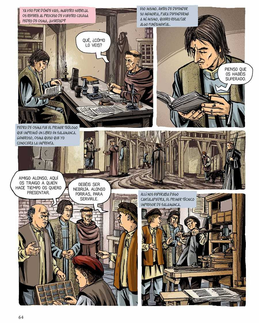 Además, se acaba de publicar el cómic Nebrija del autor argentino Agustín Comotto, en Nórdica Libros (2022), cuyas viñetas remedan episodios trascendentales de la vida del sevillano, como el de las injerencias inquisitoriales frente a los quehaceres humanistas, de las que nos ocuparemos después. Le aconteció al profesor de filosofía moral que tuvo Nebrija en la Universidad de Salamanca durante su época de estudiante, con el que trabaría amistad, y al propio Elio Antonio (una denominación que él no usó nunca), quienes en su incansable búsqueda del rigor filológico y del espíritu crítico humanista hubieron de confrontar con estrechas miras teológicas en las exégesis y traducciones de los textos bíblicos; Nebrija salvaría la situación gracias a los reemplazos inquisitoriales y a la intercesión definitiva del Cardenal Cisneros. Sea como fuere, esta publicación incide en la necesidad de contextualizar la vida y obra de Nebrija con el nacimiento de la imprenta y el papel determinante de esta en la difusión del Humanismo y del conocimiento (Comotto, 2022).