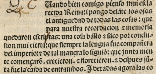 Cuando bien comigo pienso mui esclarecida Reina: y pongo delante los ojos el antigüedad de todas las cosas: que para nuestra recordación e memoria quedaron escriptas: una cosa hallo y saco por conclusión mui cierta: que siempre la lengua fue compañera del imperio: y de tal manera lo siguió: que junta mente començaron. crecieron. y florecieron. y después junta fue la caída de entrambos.