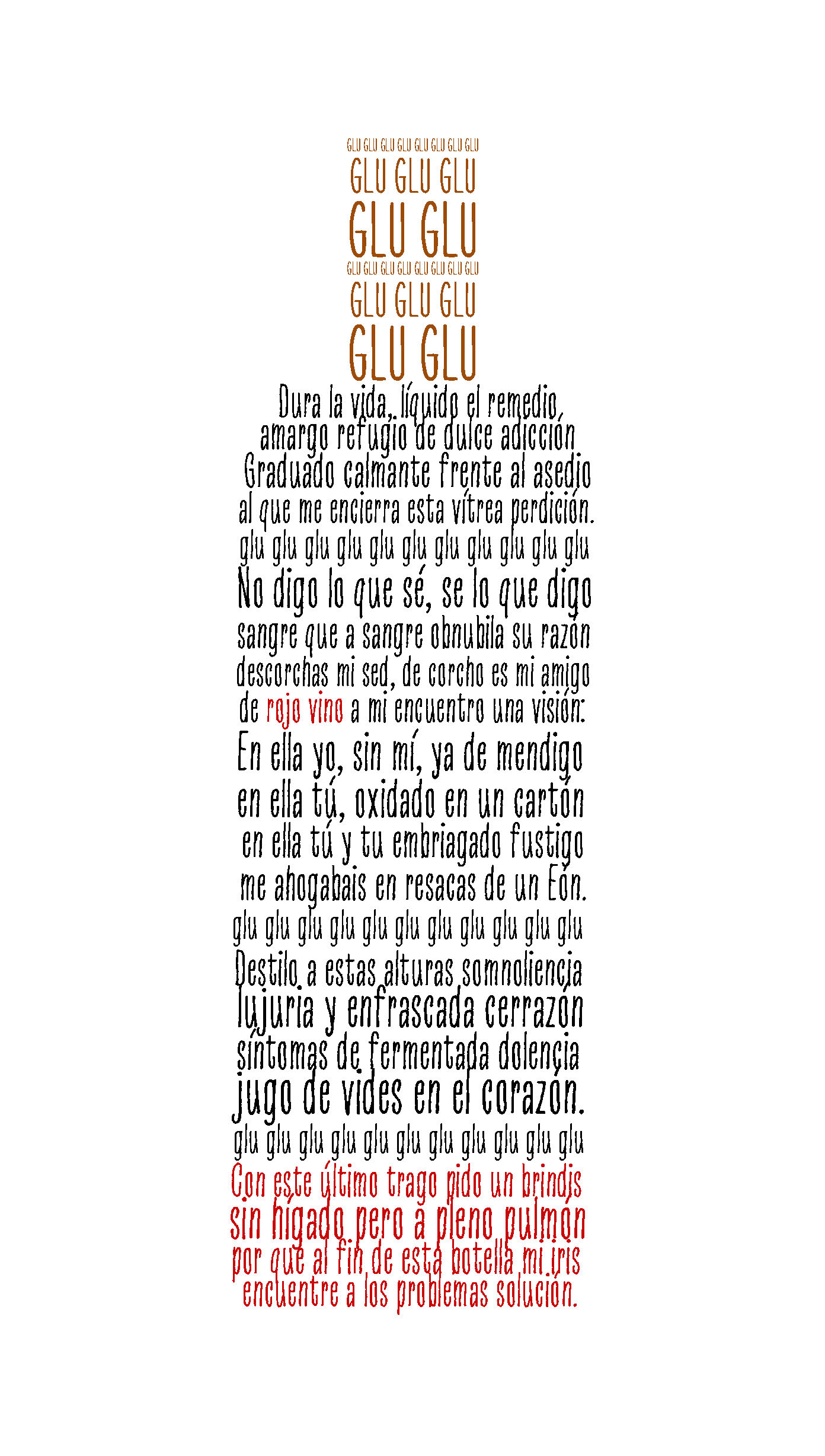 El alcohol y sus excesos, esa evasión que muchos encuentran, desesperados, en el culo de una botella. Nuestro caligrama pretende reflejar el tormento de una adicción que te ata y te desarma cuanto más libre te hace sentir. La vida, teñida de colores y fragancias con un vaso de vino en la mano, pronto puede tornarse en la oscuridad profunda de su barrica. Con estas líneas hemos tratado de hacer un recorrido por la fe que el alcohólico deposita en su bebida, la momentánea lucidez de los primeros tragos, la lujuria y el arrepentimiento que la siguen… Verso a verso, trago a trago, vemos bajar ante nosotros el nivel de la botella que conforma el caligrama. Lo hacemos cada vez más mecidos en el elixir del que tantas veces ha bebido la inspiración del artista y del que por desgracia suele sufrir la persona que tras él se esconde. Desde la tierra de las vides brindamos con versos por la salud del ser bebiente y por el tinto que tanto tienta, por que sepan compartir mesa sin excesos ni dependencias.