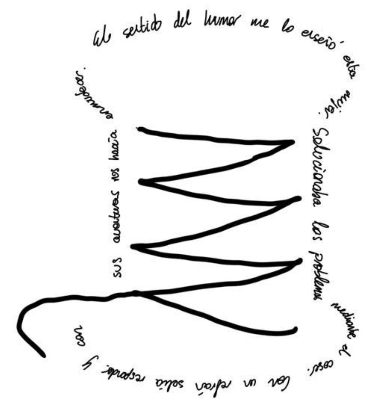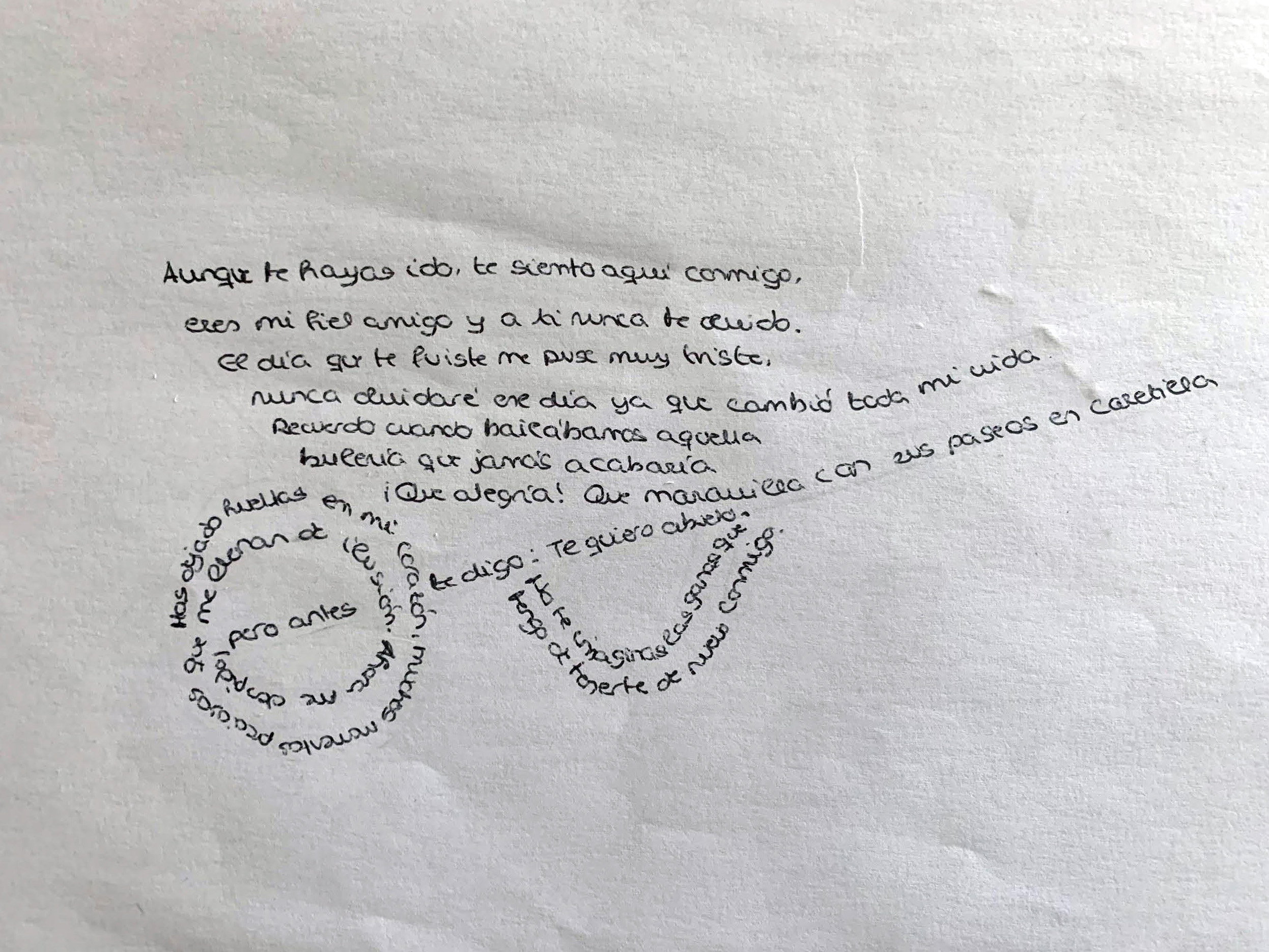Cuando nos propusieron hacer un poema llegamos a la conclusión de que queríamos dedicárselo a nuestros abuelos, en particular a la memoria de nuestros abuelos, ya que la mayoría han fallecido. En primer lugar, hicimos un borrador de diferentes aspectos que nos recordaban a nuestros abuelos y nos pusimos manos a la obra. Por ejemplo, uno de los recuerdos de Lucía con su abuelo es en el salón de su casa cantando la canción de «bulería» de David Bisbal. Otro ejemplo: Irene eligió la palabra carrerilla debido a que su abuelo le daba paseos subida en este objeto, el cual fue el escogimos para nuestro caligrama. Consideramos que el objeto utilizado para el caligrama debía ser la carretilla debido a que nos recuerda a los paseos tan especiales que hemos dado con nuestros abuelos y por qué muchas veces gracias a ellos, a su impulso al llevarnos en carretilla, hemos podido salir adelante.