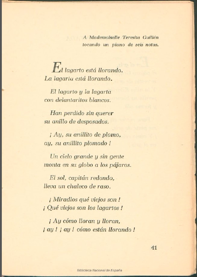 ─Luisa, tú tienes duende. Y te entiendo: en el viaje a Nueva York vi con mis propios ojos el Crack del 29 y los efectos de la crisis económica que ahora nos golpea y que estamos sufriendo, como tú tan bien reflejas. Y a mí me gusta mucho el teatro y también la poesía. He dado conferencias ─precisamente una sobre el duende─, en muchas salas de teatro, donde leía mis versos inéditos, y observaba la reacción de la gente. Algunos los publiqué, pero creaba de forma tan vertiginosa que muchos solo se conocían por esas conferencias, porque los libros tenían que esperar a que tuviera un rato libre para prepararlos. Soy un desastre, lo sé. El «Llanto por Ignacio Sánchez Mejías» lo pude publicar, trata de un amigo protector de los poetas que había dejado los ruedos y volvió para una última faena (Recitario 62). Pero ahora prefiero leeros dos poemas de amor, amor que yo viví con muchísima intensidad, liberado de las ataduras de la vergüenza y la duda sobre mí mismo, como quería Maruja Mallo. El primero se titula «Gacela primera. Del amor imprevisto» y pertenece a un poemario sobre el que estaba trabajando titulado Diván del Tamarit:
