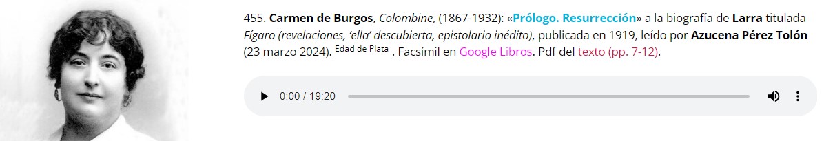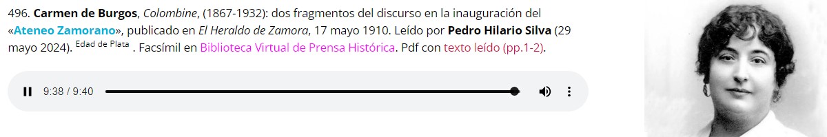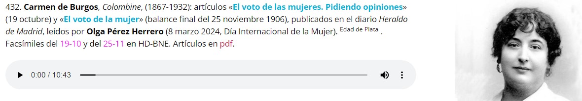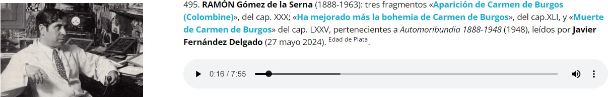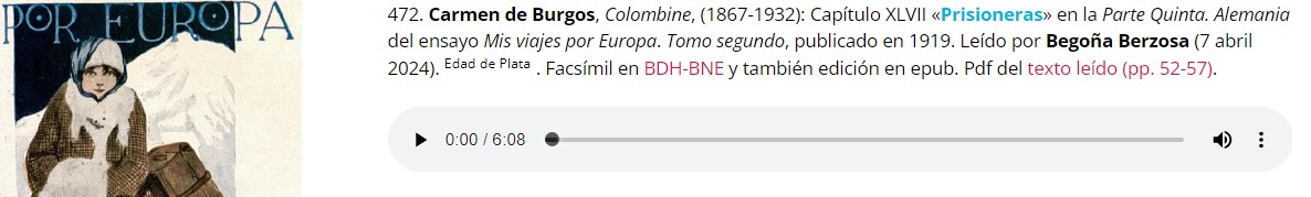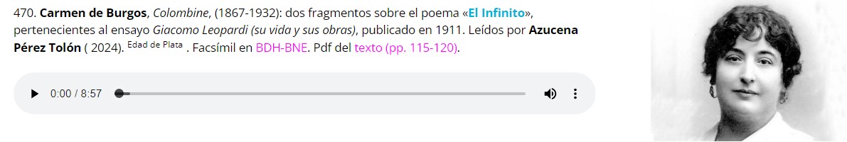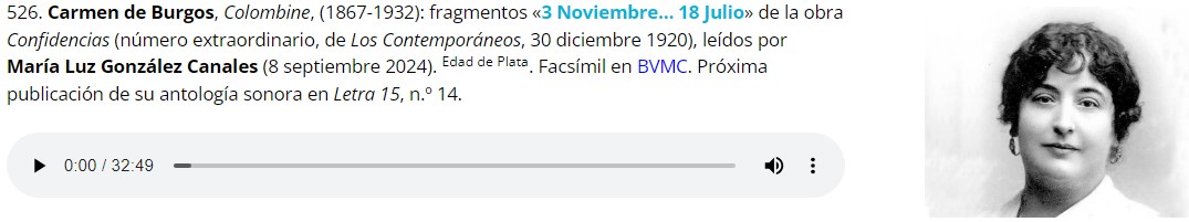 Poco a poco, Recitario ha ido formando una antología sonora de nuestra autora, que cubre los años 1906 a 1932 y que reunimos aquí, para facilitar su lectoescucha; además, incorpora también la visión de Ramón Gómez de la Serna sobre su caompañera y amiga.