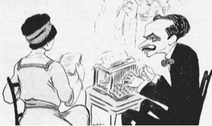 Caricatura de la pareja Catalina Bárcena y Gregorio Martínez Sierra. El Duende, 22-2-1914 pág. 7.