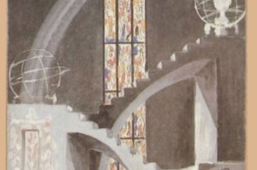 En el primer acto, para dar la impresión de primavera en un jardín florentino, tras las columnas había un fondo purísimo y radiante azul. En los huecos entre las cinco columnas del fondo, se alzaban cuatro magníficos cipreses. El banco de mármol estaba a la izquierda del espectador; las mesitas para la máquina de escribir y los papeles, a la derecha. Unas cuantas sillas de jardín.