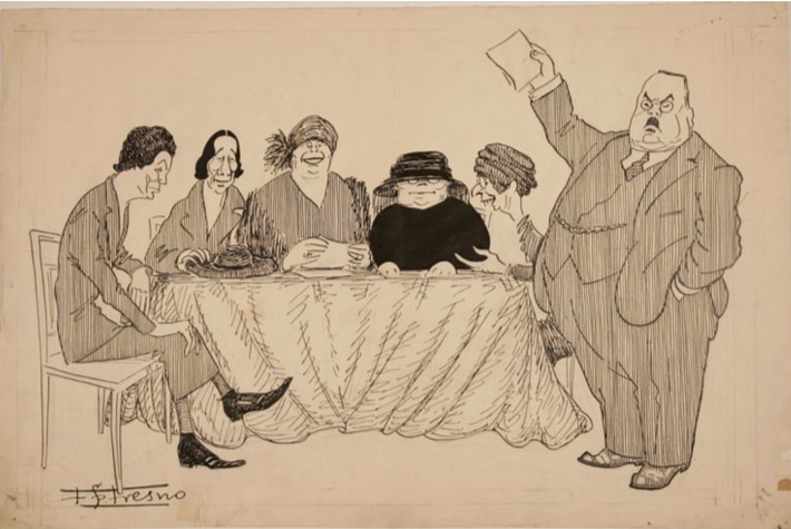 Acto abolicionista en el Teatro Eslava. De izquierda a derecha, Victoria Kent, Beatriz Galindo, María Martínez Sierra, Aurora Riaño, Pilar Oñate y el Dr. César Juarros. Caricatura de Fresno. ABC 26-2-1924.