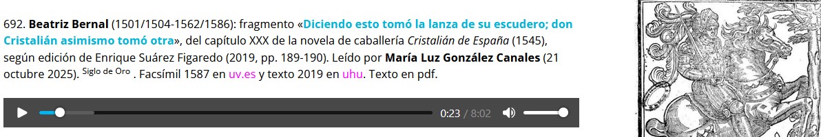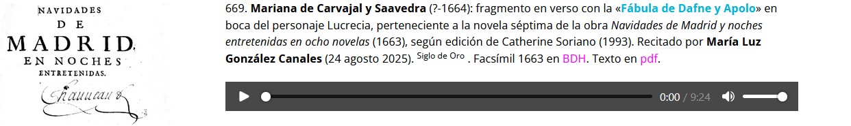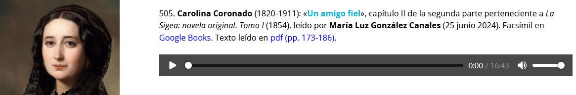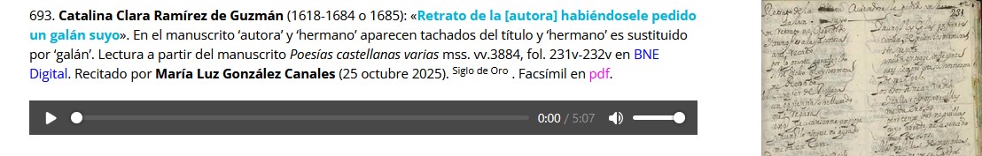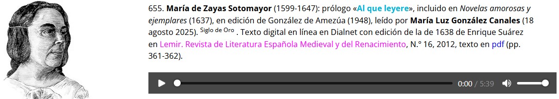 Additionally, we present a audio recitation that ranges from the puellae doctae of Queen Isabella's court to the Baroque women writers of the first half of the 17th century, including poets from songbooks, convent and mystical writers, novelists, playwrights, and even authors of chivalric books. The sound gallery represents a proposal to encourage reading through listening and an approach to the context, figure, and works of this gallery of women writers.