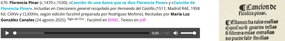 Incluimos la grabación de tres fragmentos del Laurel dedicados a Feliciana de Guzmán, Cristobalina Fernández y La Latina.