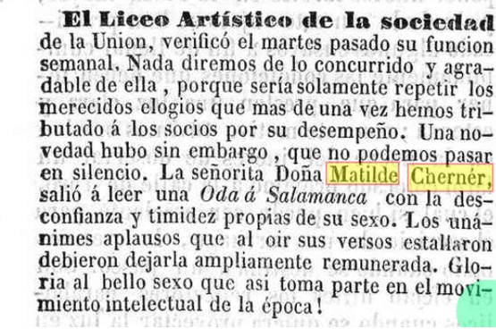 Una novedad hubo sin embargo, que no podemos pasar en silencio. La señorita Doña Matilde Cherner salió a leer una Oda a Salamanca con la desconfianza y timidez propias de su sexo. Los unánimes aplausos que al oír sus versos estallaron debieron dejarla ampliamente remunerada. ¡Gloria al bello sexo que así toma parte en el movimiento intelectual de la época!