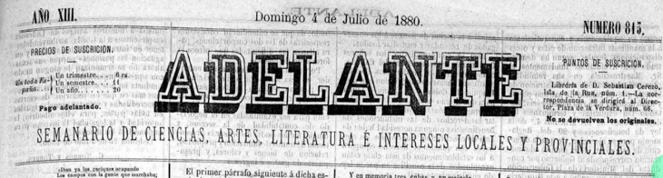 Adelante: revista salmantina de ciencias, artes, literatura é intereses materiales: Año XIII, Número 813, 1880 julio 4 (BVPH).