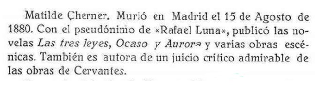 El caso de Matilde Cherner, mujer que vivió exclusivamente en el siglo XIX, pudiera ser paradigmático. El seudónimo que utilizó Matilde fue el de Rafael Luna, formado por su segundo nombre y su tercer apellido.
