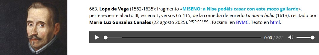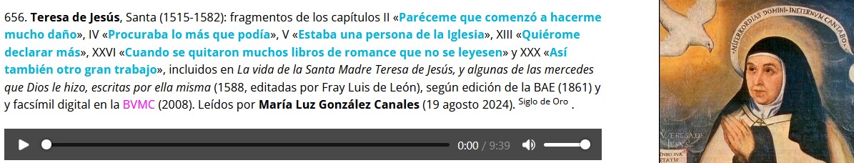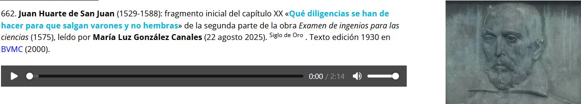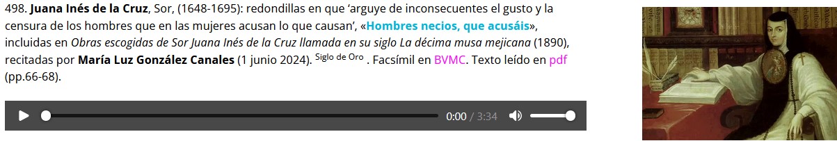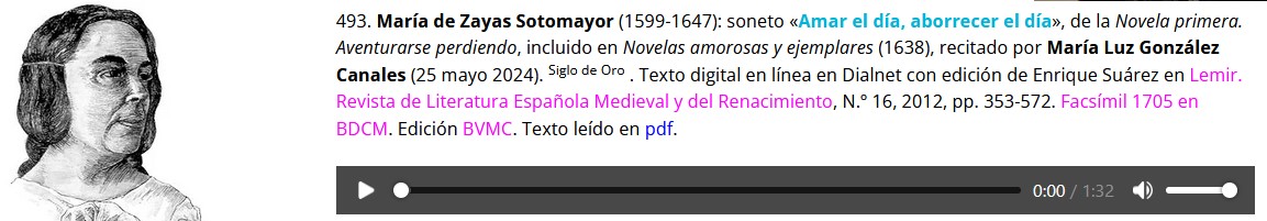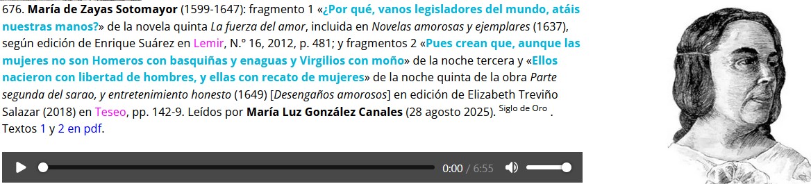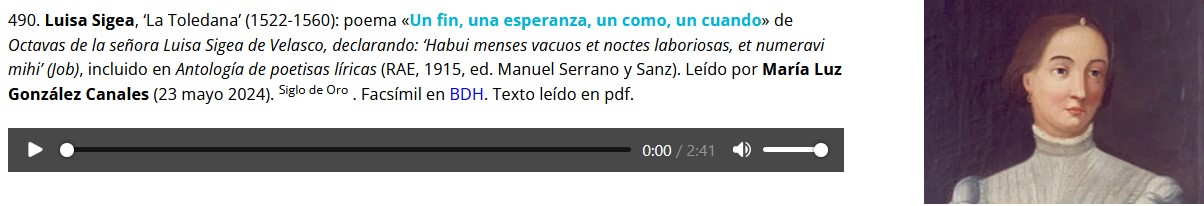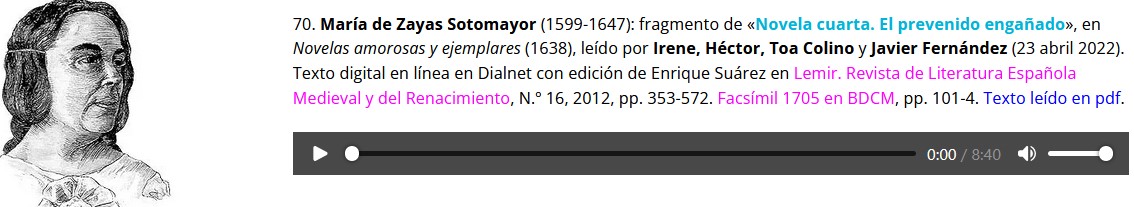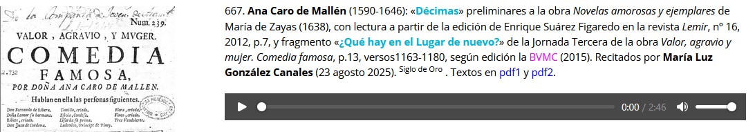 Additionally, we present a audio recitation that ranges from the puellae doctae of Queen Isabella's court to the Baroque women writers of the first half of the 17th century, including poets from songbooks, convent and mystical writers, novelists, playwrights, and even authors of chivalric books. The sound gallery represents a proposal to encourage reading through listening and an approach to the context, figure, and works of this gallery of women writers.