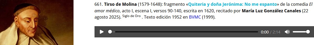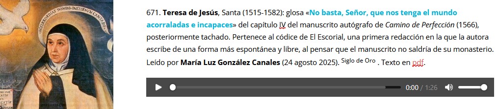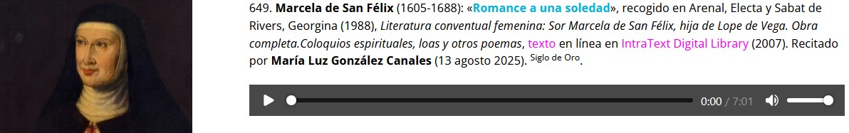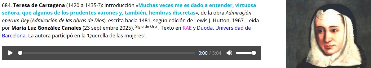 Complementariamente, presentamos un recitario sonoro que abarca desde las puellae doctae de la corte de Isabel la Católica, hasta las escritoras barrocas de la primera mitad del siglo XVII, pasando por poetisas de cancioneros, escritoras conventuales y místicas, novelistas, autoras teatrales e incluso de libros de caballerías. La muestra sonora supone una propuesta para incentivar la lectura mediante la escucha y un acercamiento al contexto, figura y obras de esta galería de autoras.