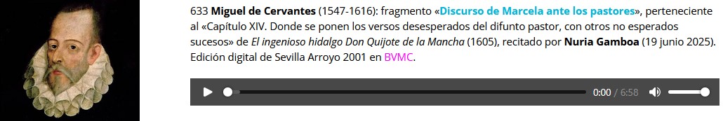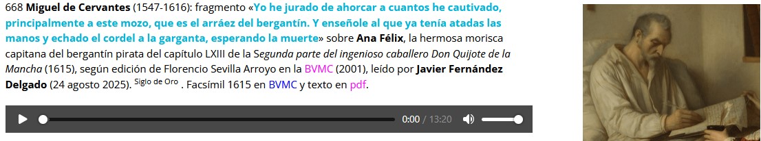 A lo largo de nuestro artículo se presentan fragmentos textuales significativos de los recitados mencionados alojados en Recitario, que son los que sostienen el hilo principal del discurso y se enlazan los audios completos, para el lector interesado en profundizar en ellos, aunque no es imprescindible su escucha simultánea a la lectura del artículo, a pesar de que, sin duda, le sirven de perfecto complemento y demostración.