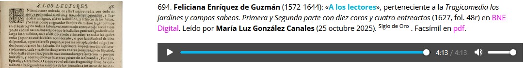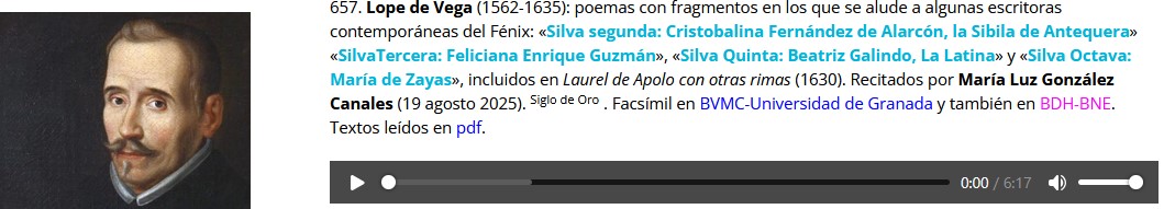 Incluimos la grabación de tres fragmentos del Laurel dedicados a Feliciana de Guzmán, Cristobalina Fernández y La Latina.