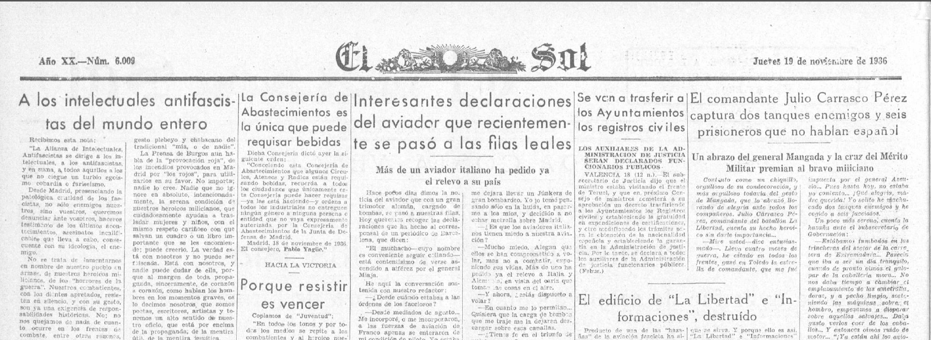 El diario El Sol, que había sido fundado por M. Urgoiti en 1917, publicó el 17 de noviembre de 1936, en la sección a 'Los intelectuales en la guerra civil' de su página tercera, la locución de María Teresa León que ella misma había leído en las emisiones radiofónicas de Altavoz del Frente, organización dependiente de la Comisión de Agitación y Propaganda del PCE, creada por César Falcón al inicio de la guerra, en agosto de 1936. Desarrolló una intensa actividad que, desde los inicios, aunó a muchos intelectuales, no necesariamente afiliados al PCE.