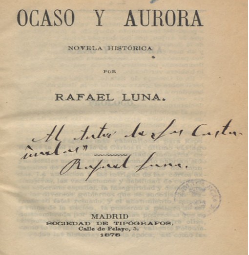 Portada del ejemplar de Ocaso y aurora : novela histórica / por Rafael Luna. BNE Digital.