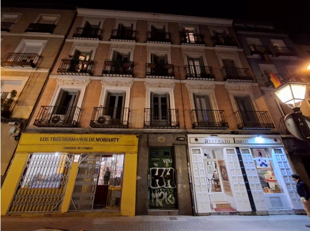 Fachada de la calle La Palma, 21 de Madrid. En este inmueble, Matilde Cherner vivirá durante sus últimos años y en ese domicilio, hoy flanqueado por dos librerías, fallecerá el 15 de agosto de 1880. Anteriormente había residido en la calle Horno de la Mata, 10.