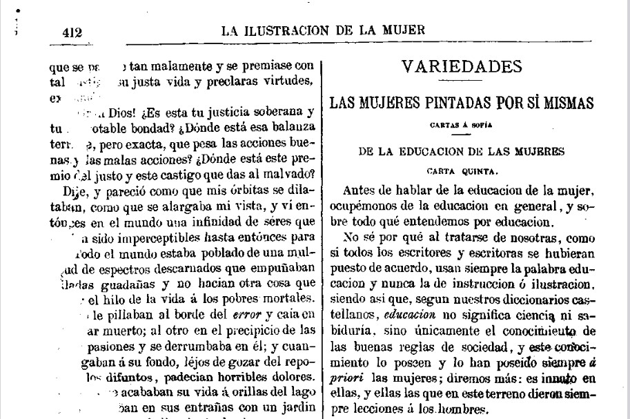Al reclamar hoy con tanta insistencia los hombres la educación ó ilustración de las mujeres, ni han especificado qué clase de ilustración ha de ser esta, ni mucho menos si con ella ha de adquirir nuestro sexo el derecho de profesión.