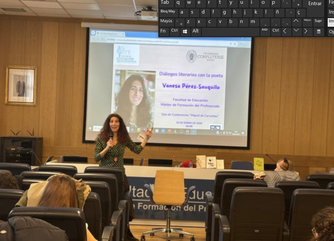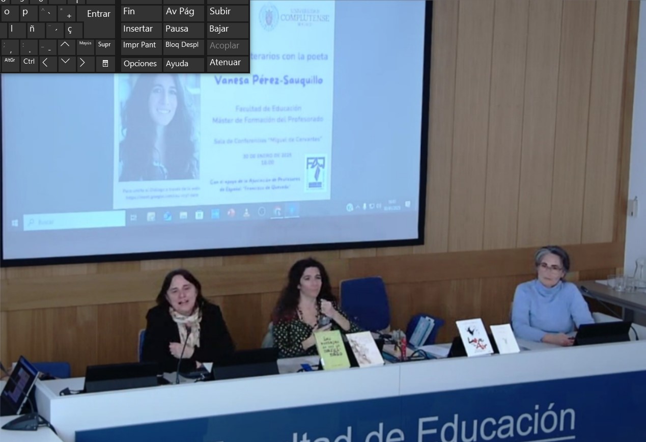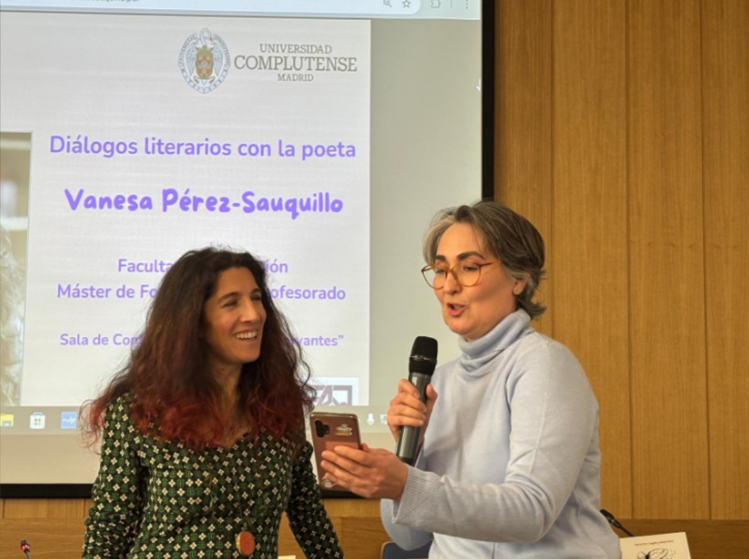 La poeta Vanesa Pérez-Sauquillo participó el 28 de enero de 2025 en la décimo quinta edición de los Diálogos literarios que organiza la Facultad de Educación de la Universidad Complutense de Madrid en colaboración con la Asociación de Profesores de Español «Francisco de Quevedo». El acto contó con la presencia de la autora a la que acompañaron en la mesa Silvia Eva Agosto Riera y Olga Pérez Herrero.